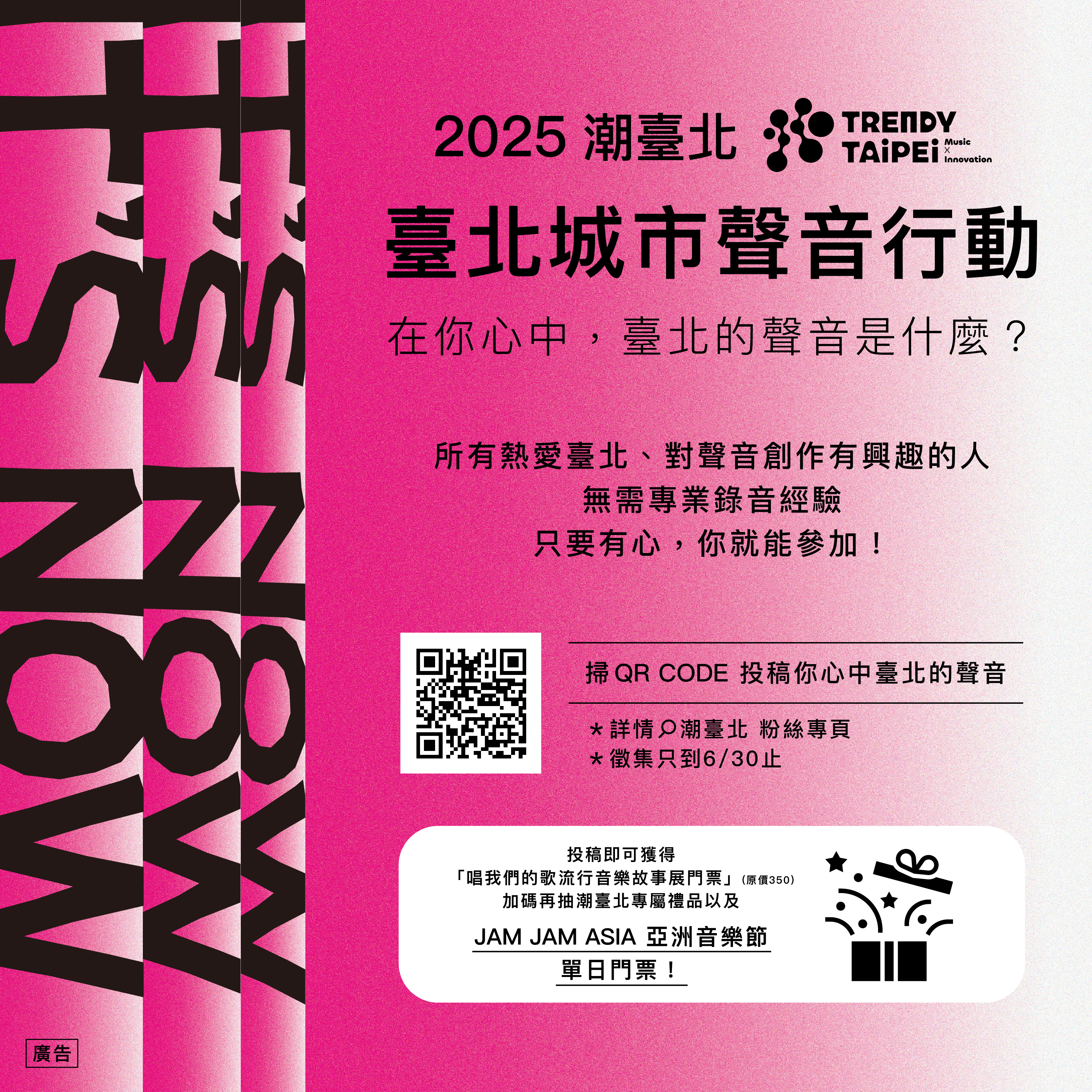 2025「潮臺北 TRENDY TAIPEI」來了! 臺北市不是見證潮流,我們就是潮流的製造機,更是未來的定義者。經過2024年試辦場, 2025年首屆「潮臺北 TRENDY TAIPEI: It's now」即將盛大舉辦,首波前導活動「臺北城市聲音行動」率先起跑,透過線上暖身活動邀請全民參與,徵集最能代表臺北的聲音,只要投稿作品就能享有專屬福利,參加者可獲得臺北流行音樂中心文化館常設展門票1張,另外還能加碼抽獎限量潮臺北專屬禮品組及JAM JAM ASIA亞洲音樂節單日票。