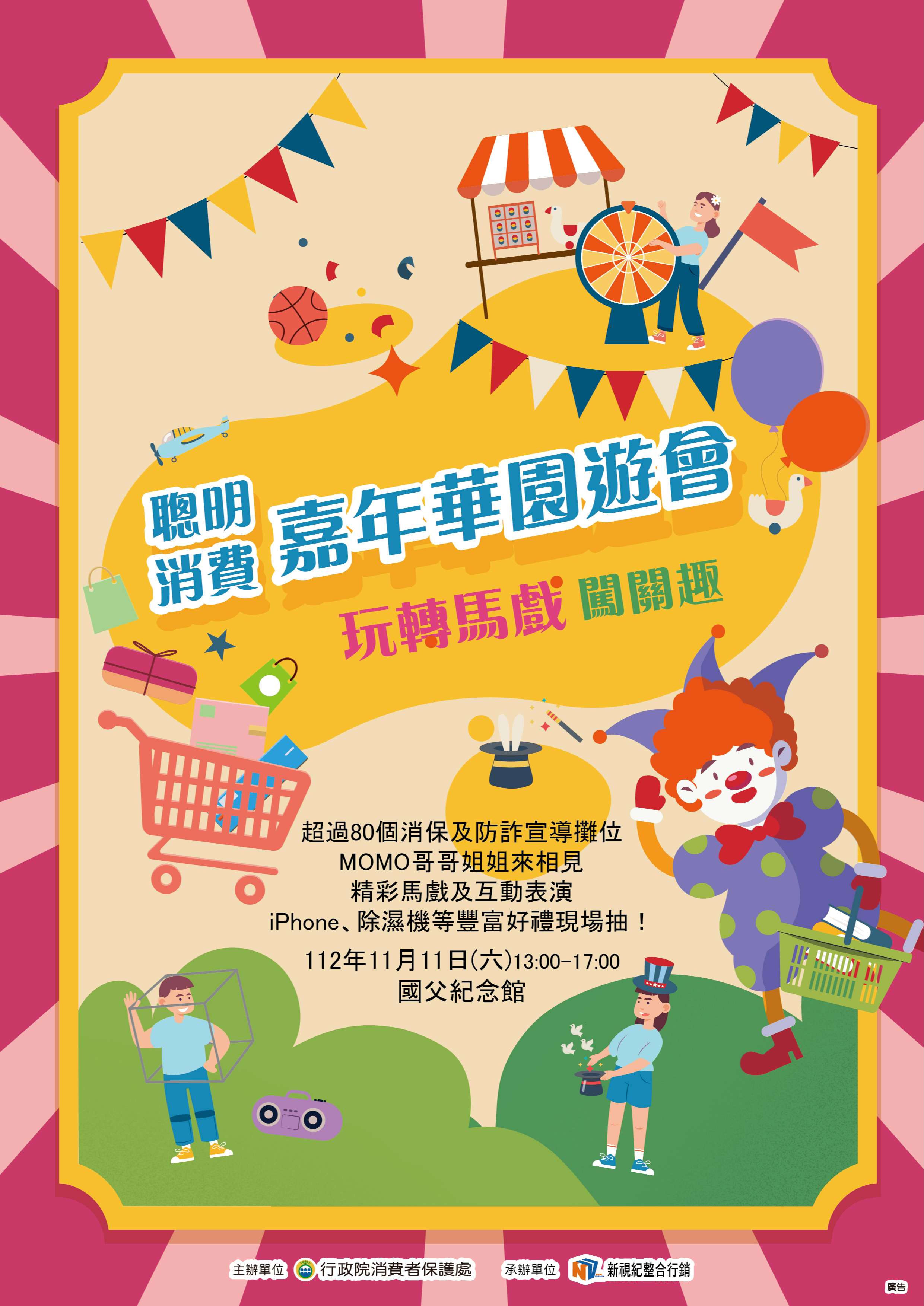 行政院消費者保護處為強化消費者自我保護知能,訂於112年11月11日(星期六)下午1時至5時於國父紀念館舉辦旨揭活動,除設有逾80個攤位供學習體驗與闖關抽獎外,並安排魔術、小丑表演與電視兒童臺哥哥姐姐唱跳、部會上臺秀等舞臺表演,透過寓教於樂方式,傳達重要消保與防詐觀念,歡迎學童與家長踴躍參加。