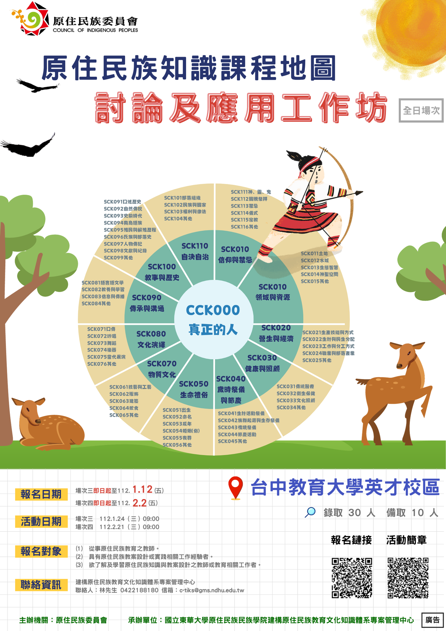 二、活動辦理導入原住民族知識雲端平台系統應用與操作,藉由資訊科技應用將國小、國中及高中不同學習階段進行原 住民族教育文化課程地圖之應用與討論,參與者可以獲得 資訊科技導入教育課程製作相關知能,並希望能有效轉化 為實務經驗或研究,以利推動原住民族知識課程發展以及 增能教師原住民族知識課程教學能量,鼓勵從事原住民族 教育之教師、相關學者或原住民教案設計實踐工作者,踴 躍報名。