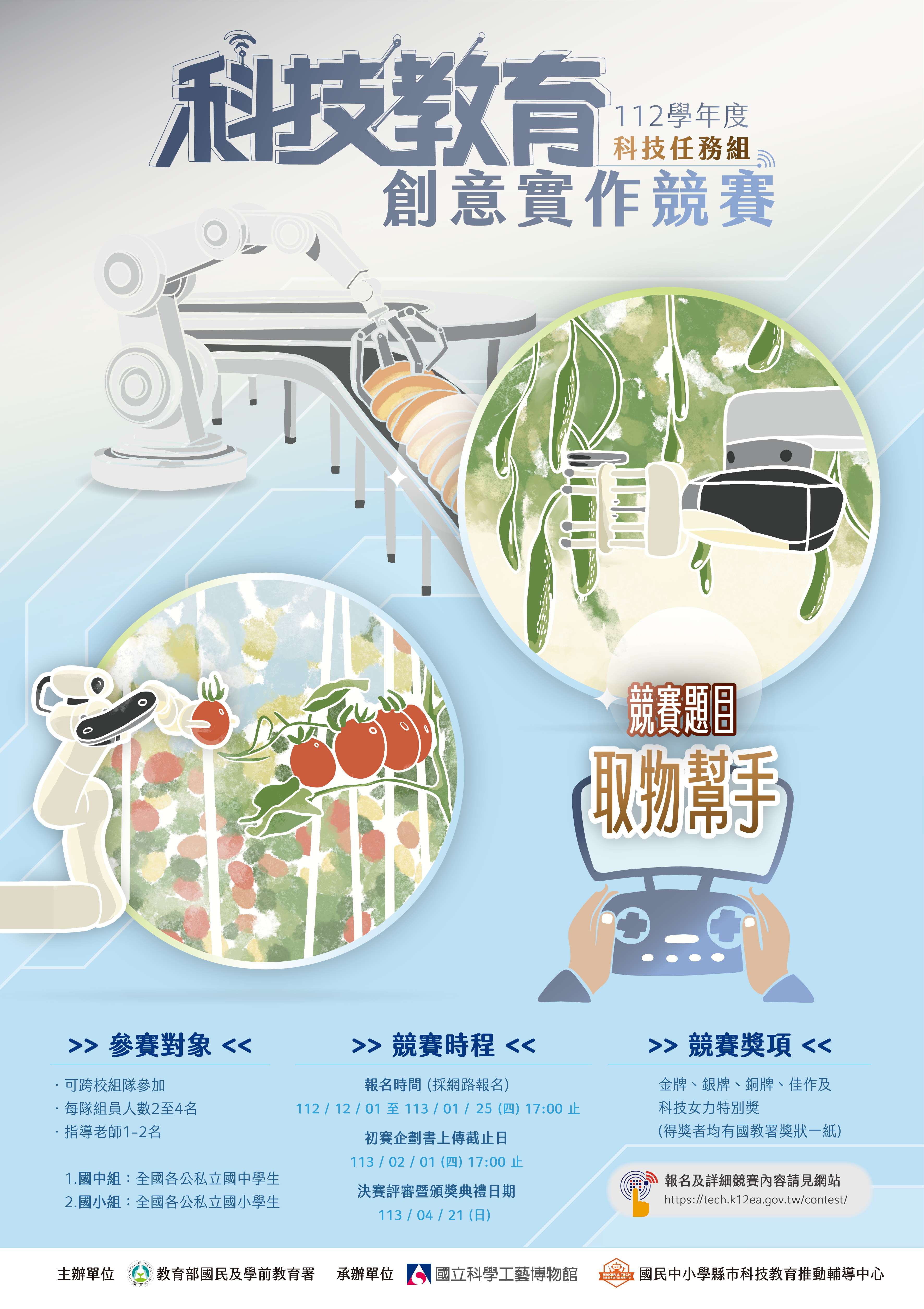 二、旨揭競賽原報名時間至112年1月18(星期四)截止,現延長至113年1月25日(星期四)下午5時止,競賽資訊詳見競賽網站(網址:https://tech.k12ea.gov.tw/contest/),請鼓勵所屬師生踴躍報名參加。