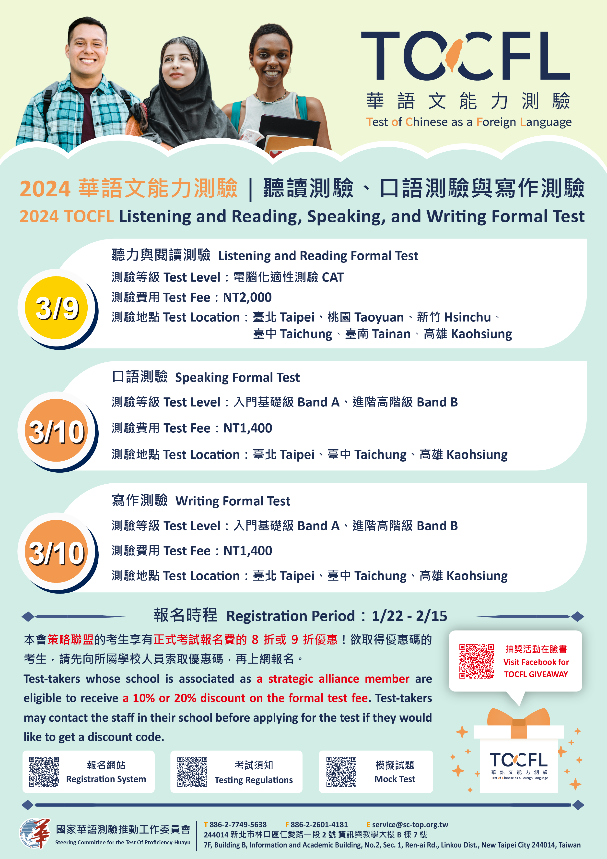 六、抽獎活動:凡報考任一測驗並完成繳費者,可參加華測FB 粉絲專頁抽獎活動。詳情請見粉絲專頁貼文: https://www.facebook.com/SCTOP.TOCFL。