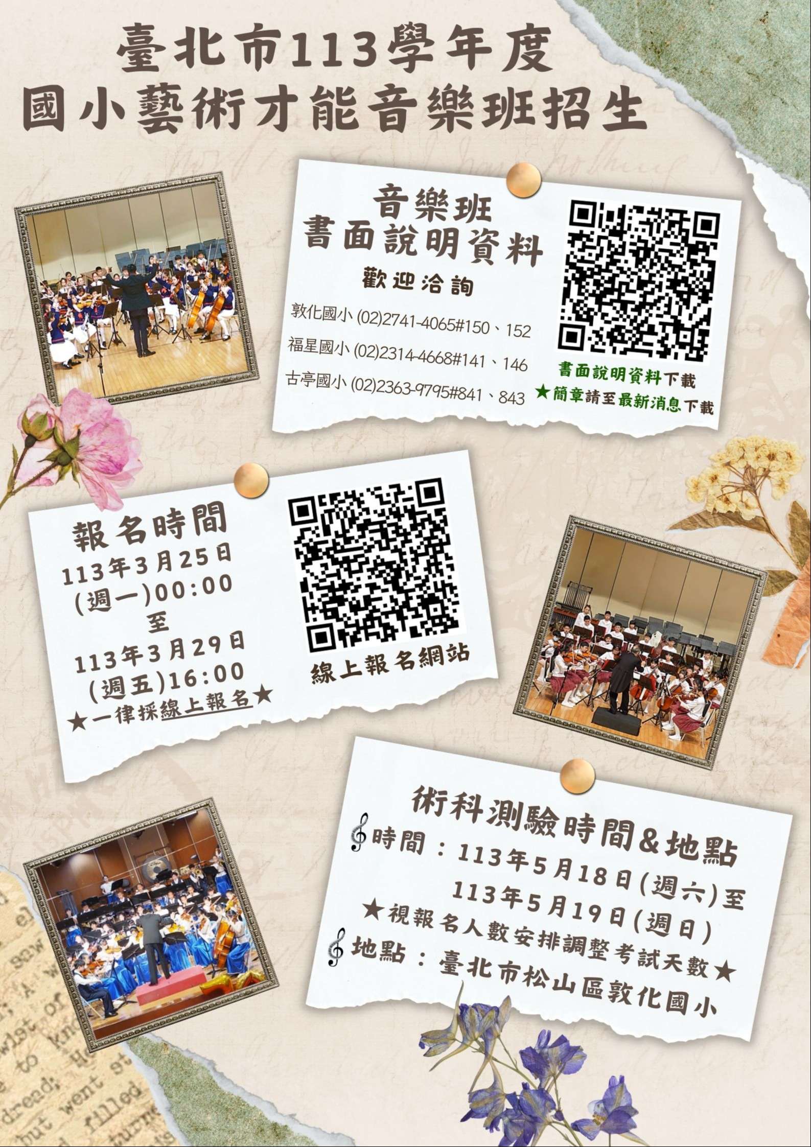 二、報名時間及方式:113年3月25日(星期一)00:00起至3月 29日(星期五)16:00止,於本市國中小藝才班鑑定報名系統(https://tparttalent.tp.edu.tw)報名。 三、有關國小藝術才能音樂班招生鑑定或課程相關問題,敬請洽詢以下學校: