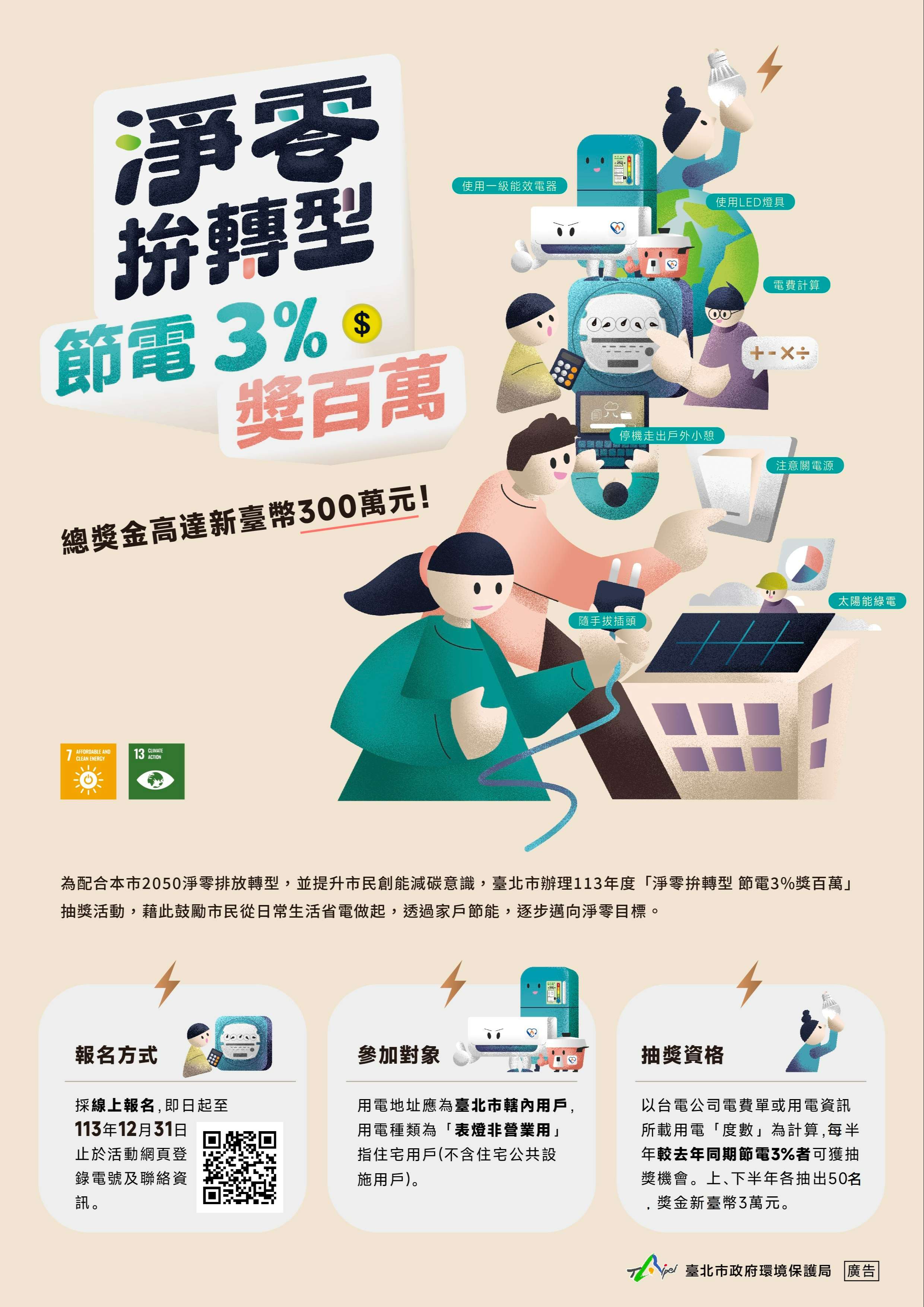 為鼓勵市民落實節能減碳行動,臺北市政府環境保護局推出「淨零拚轉型節電3%獎百萬」抽獎活動(網址:https://energysaving.gov.taipei/),即日起至113年12月31日辦理,