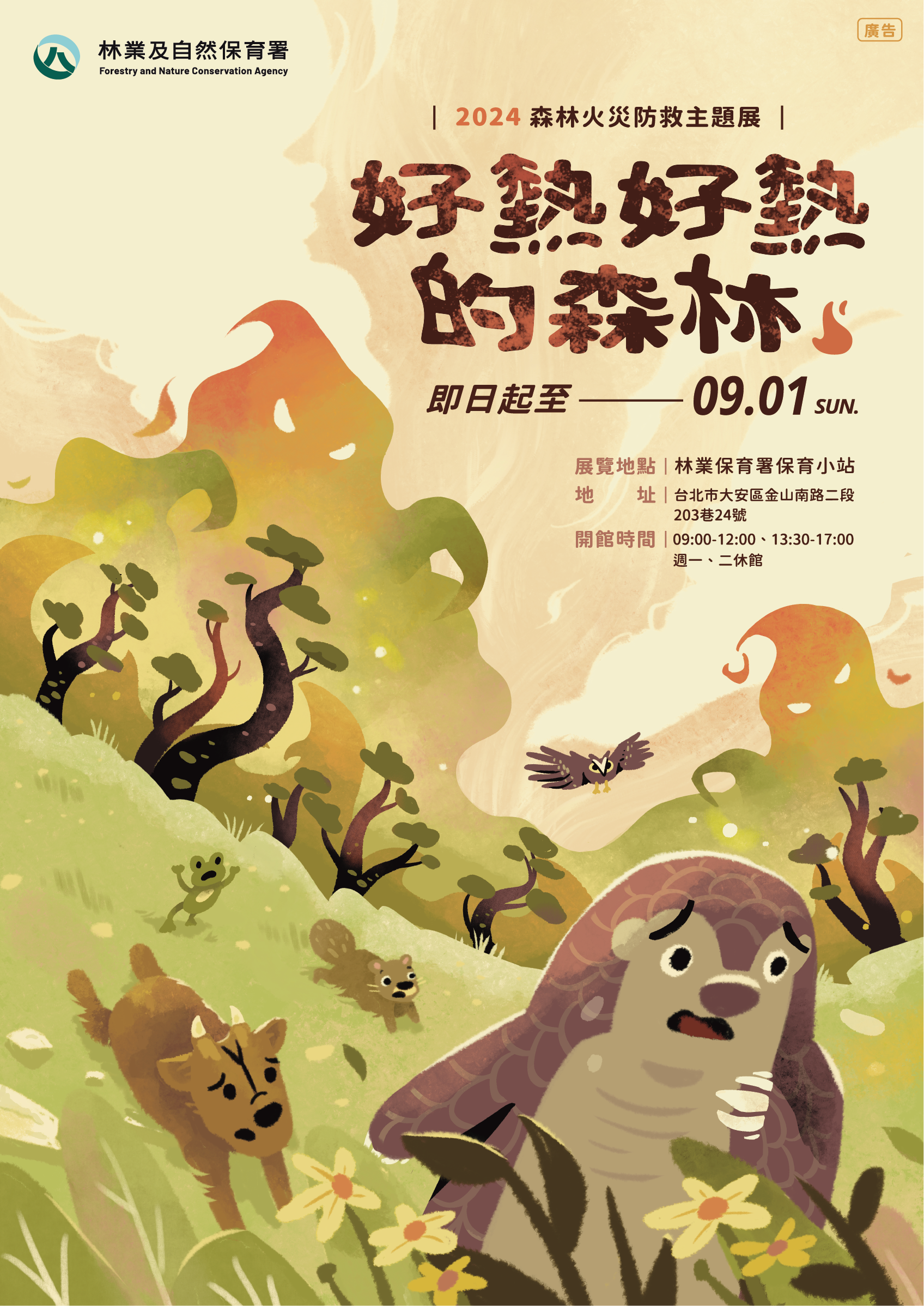 一、因全球暖化、極端氣候影響,致全球森林火災事件頻傳,為強化國人對於森林火災災害瞭解及防災機制,爰本署於臺北市金山南路2段203巷22號、24號本署保育小站,規劃森林火災防救主題展,展期至113年9月1日止,並搭配每月相關主題活動,透過靜態展覽與動態活動結合,讓民眾體認到森林火災防救及維護森林資源的重要性,建立正確的森林火災防災知識,進而守護臺灣的山林資源。