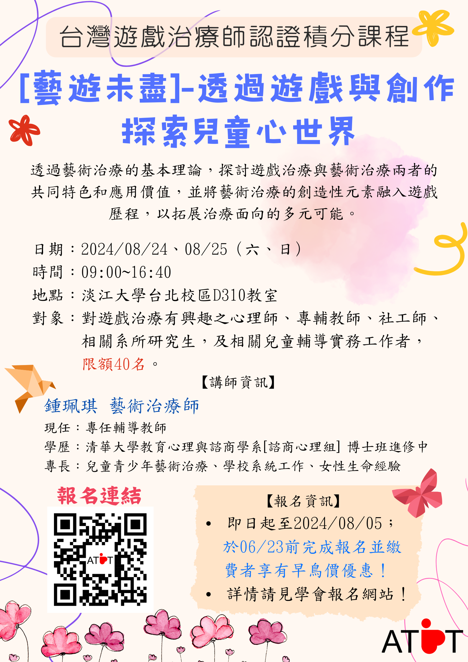 一、2024台灣遊戲治療師認證積分課程【2024台灣遊戲治療師認證積分課程】:「藝遊未盡-透過遊戲與創作探索兒童心世界」課程時間及講師資訊。