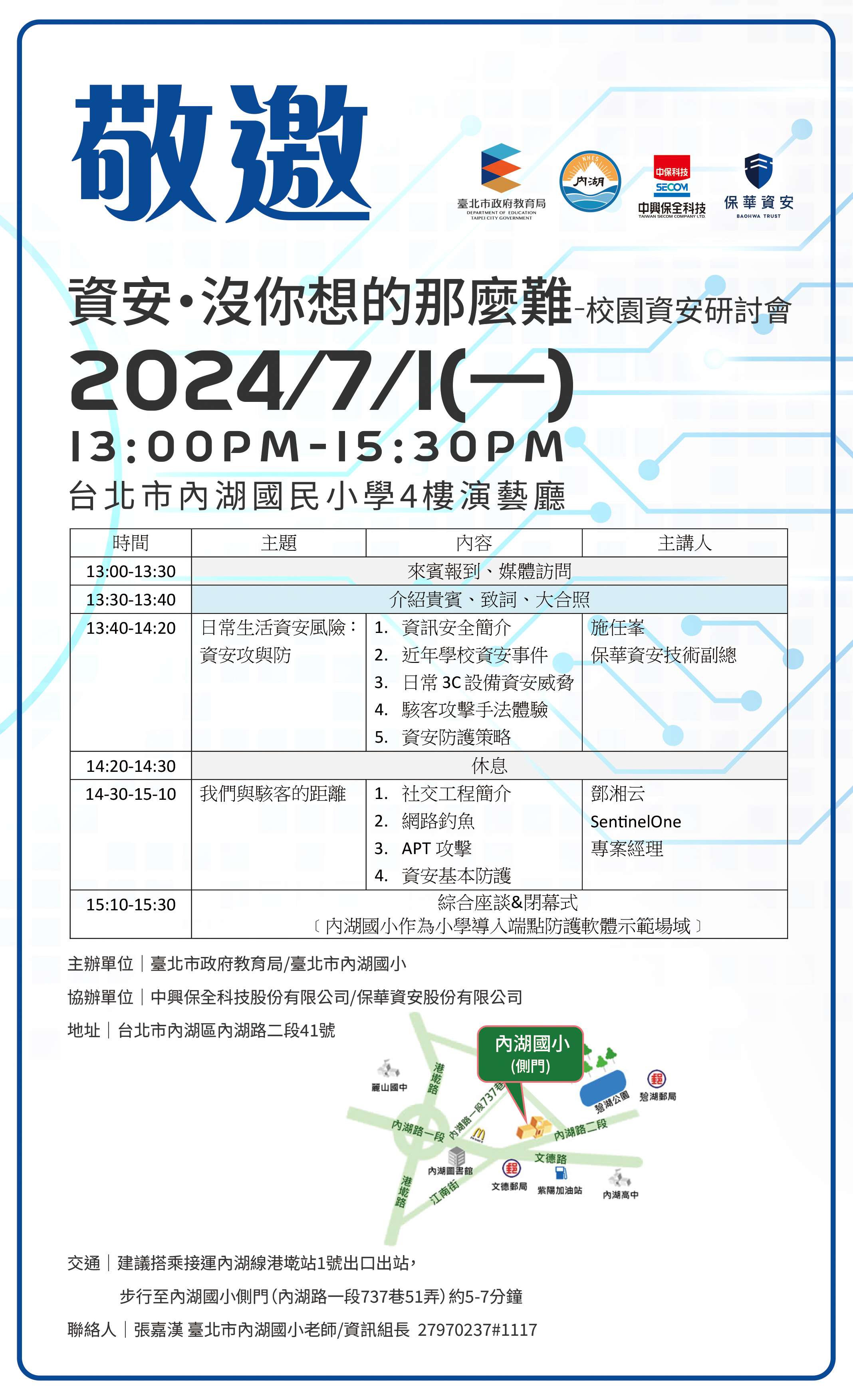 一、為因應數位科技的迅速發展,提升教師資訊安全知能,故辦理此研討會,旨揭活動資訊說明如下: