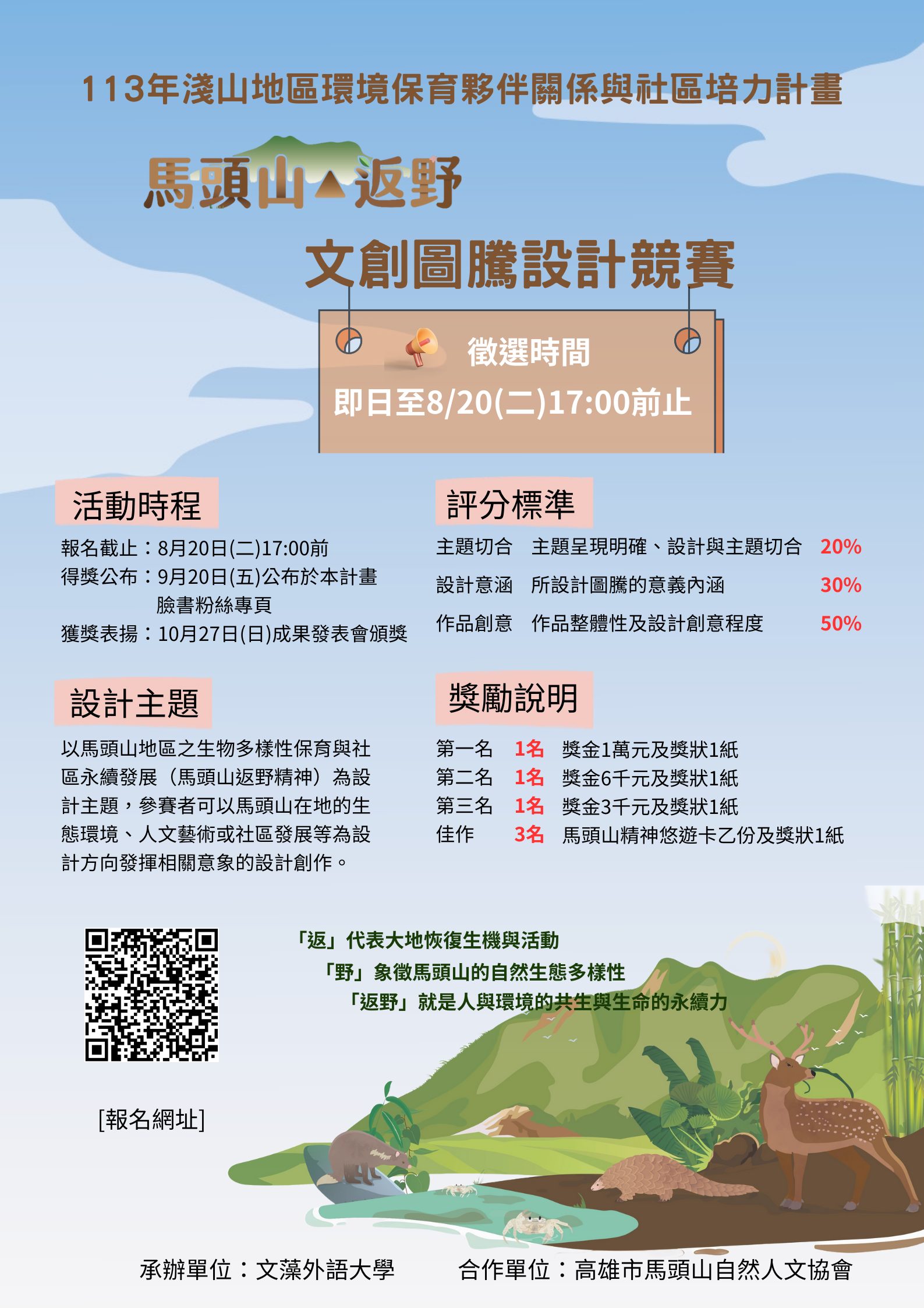 二、為使更多人認知馬頭山,並加深民眾對馬頭山地區自然生態多樣性維護的公民意識與價值,本計畫辦理「馬頭山返野文創圖騰設計競賽」(以下簡稱本活動)。