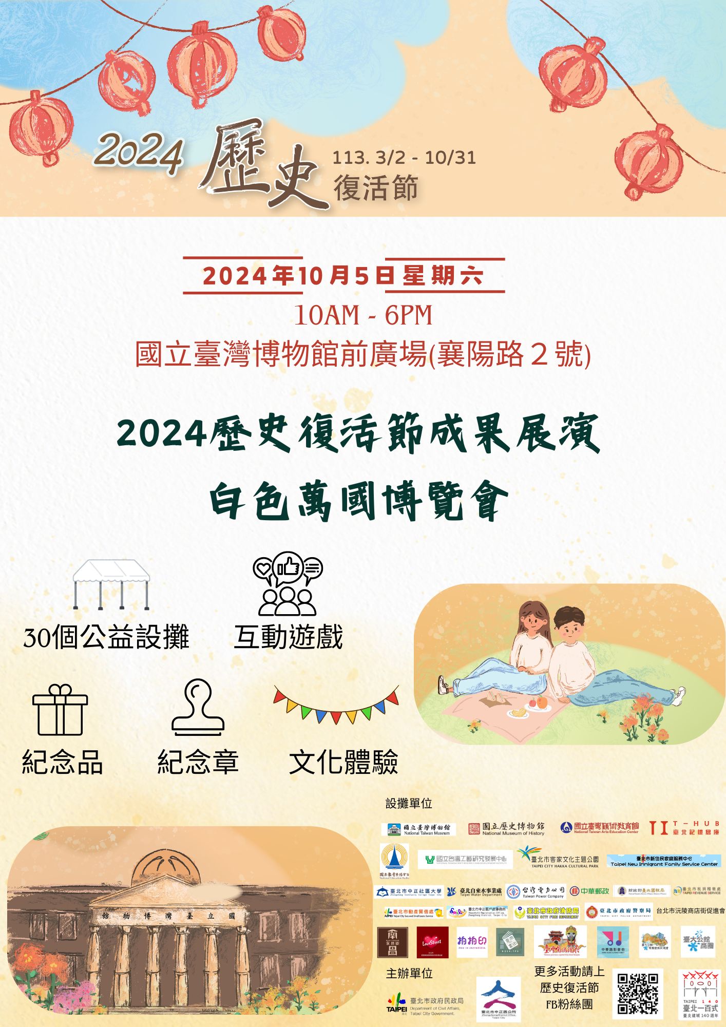 臺北市中正區公所將在113年10月5日(星期六)上午10時至下午6時於二二八和平公園-國立臺灣博物館本館(襄陽路2號)前廣場,舉辦「2024歷史復活節-白色萬國博覽會」,展演歷史復活節活動成果,特邀區內各機關、博物館、古蹟場館等一起設置30個公益攤位,邀請您一同品文化、玩體驗、拾回憶,感受獨特的中正區地方特色!更多活動詳情請上歷史復活節FB粉絲團(https://www.facebook.com/papagozhongzheng),或上臺北市中正區公所網站基層藝文專區(https://zzdo.gov.taipei/基層藝文)查詢。