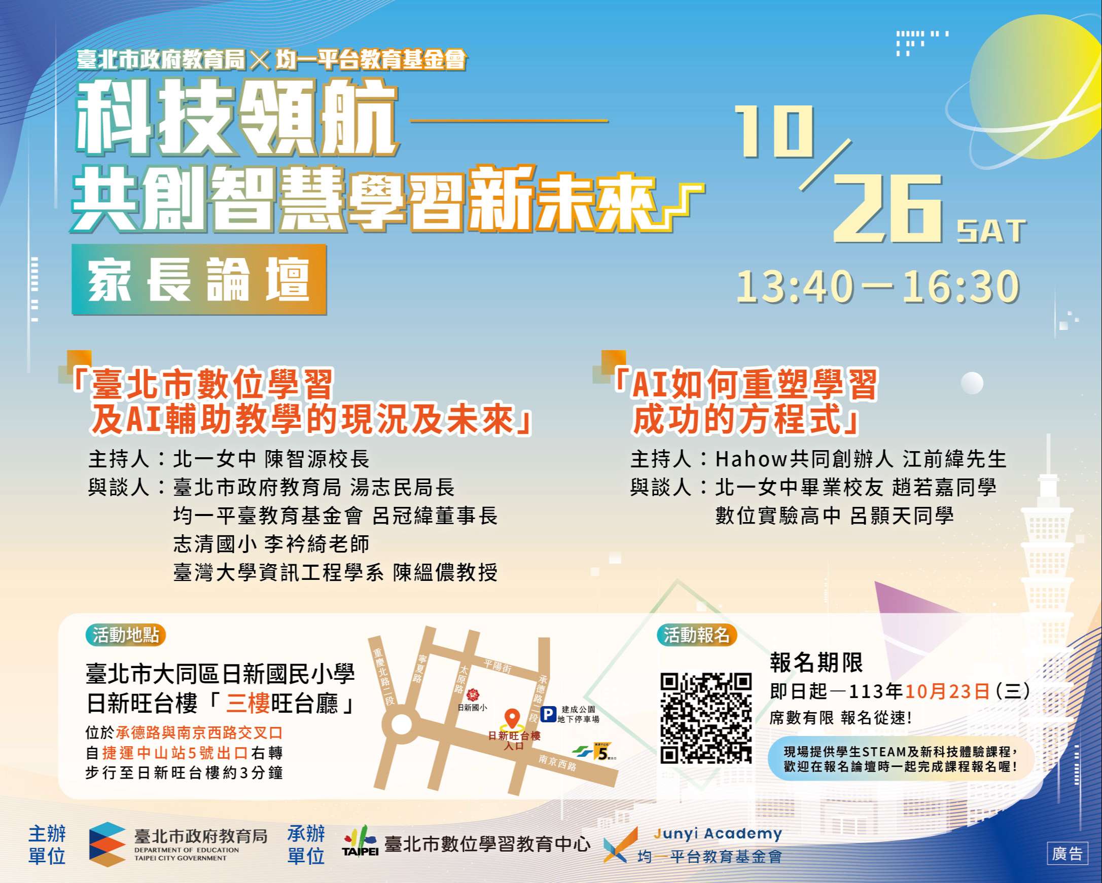 (三)活動地點:臺北市大同區日新國民小學日新旺台樓(位於承德路與南京西路交叉口,自捷運中山站5號出口右轉步行至日新旺台樓約3分鐘)。