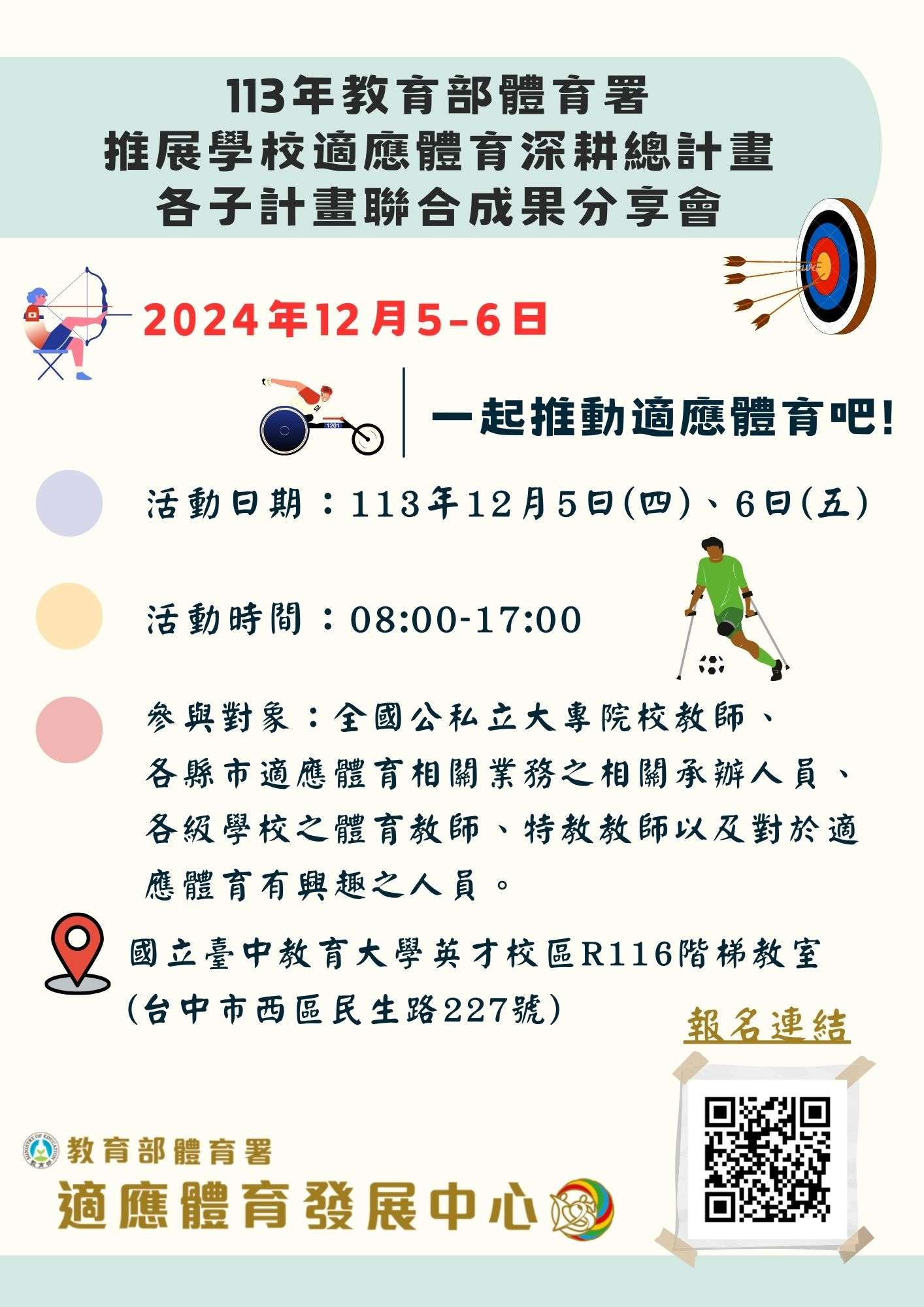 一、為提升全國各地方政府和各級學校的適應體育推動量能, 促進跨階段、跨領域、跨區域之教師得以共同分享資源及交流學習,並提供有興趣申請適應體育相關計畫的單位一同 觀摩,該署特委請國立臺灣師範大學辦理旨揭活動。