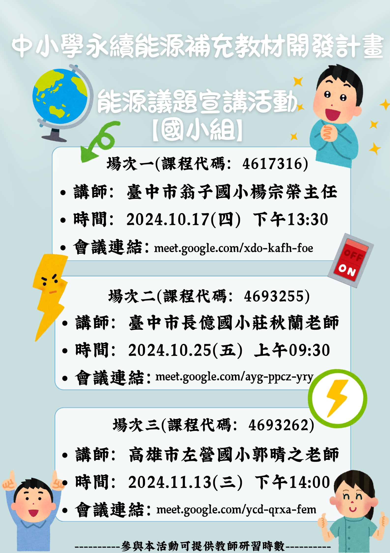 (二)【國小組】場次二(課程代碼:4693255);講師:臺中市長億國小莊秋蘭老師;時間:113年10月25日(星期五)上午9時30分至11時0分;Google Meet連結:meet.google.com/ayg-ppcz-yry。