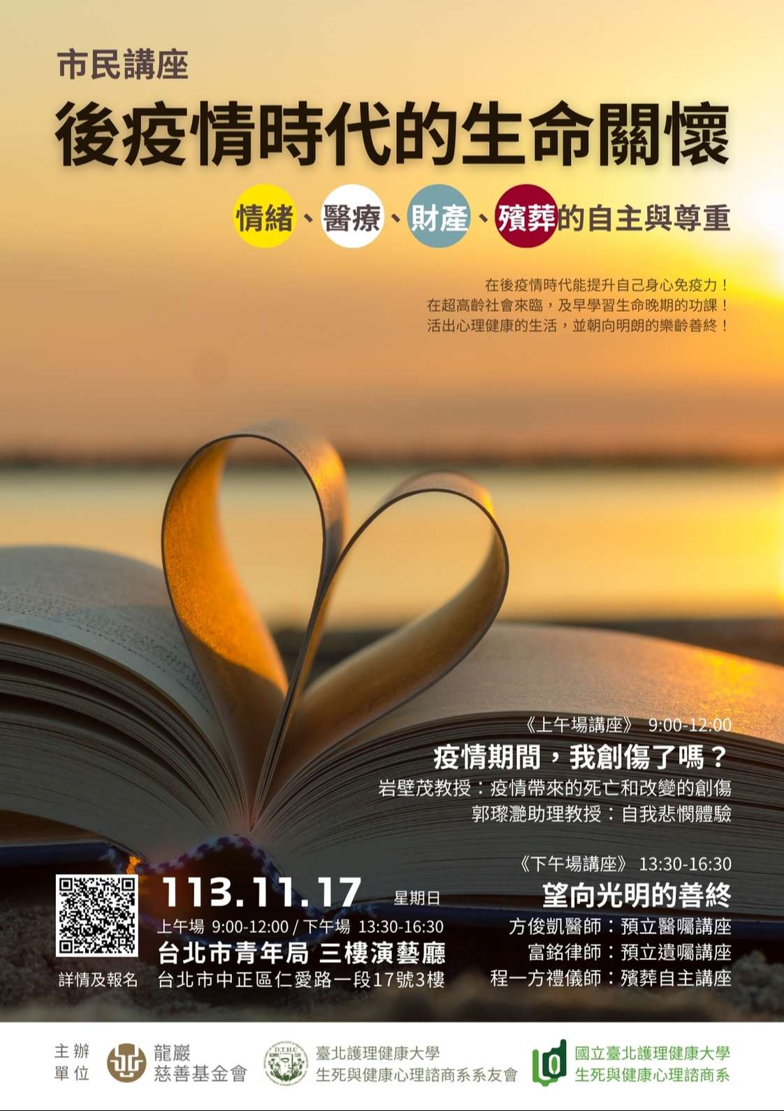 二、講座主題:「後疫情時代的生命關懷—『情緒、醫療、財產、殯葬』的自主與尊重」。