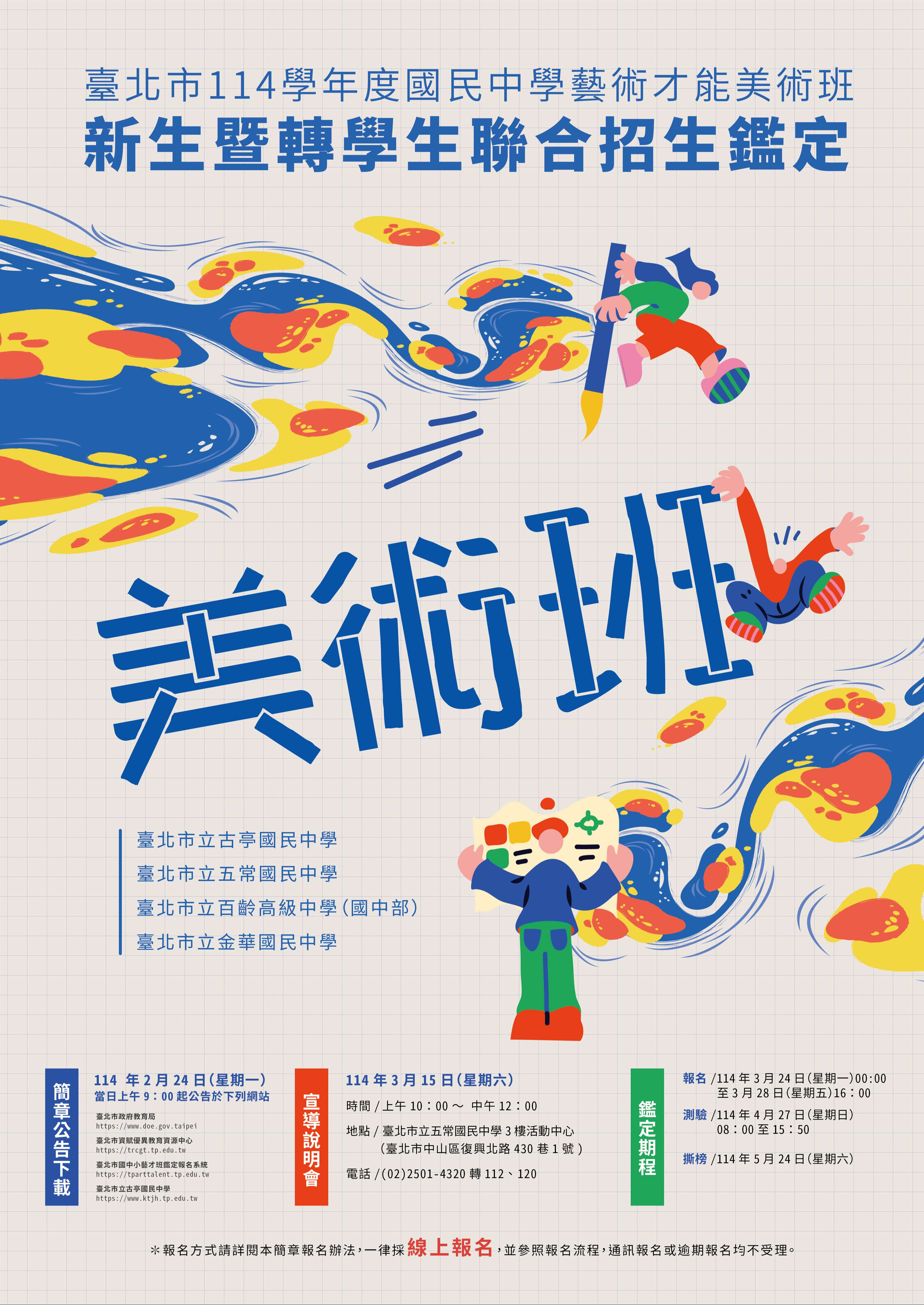 一、114學年度招生鑑定報名自114年3月24日(星期一)0:00至 3月28日(星期五)16:00,3月15日宣導說明會,4月27日 測驗,5月24日撕榜,詳情請參閱簡章。