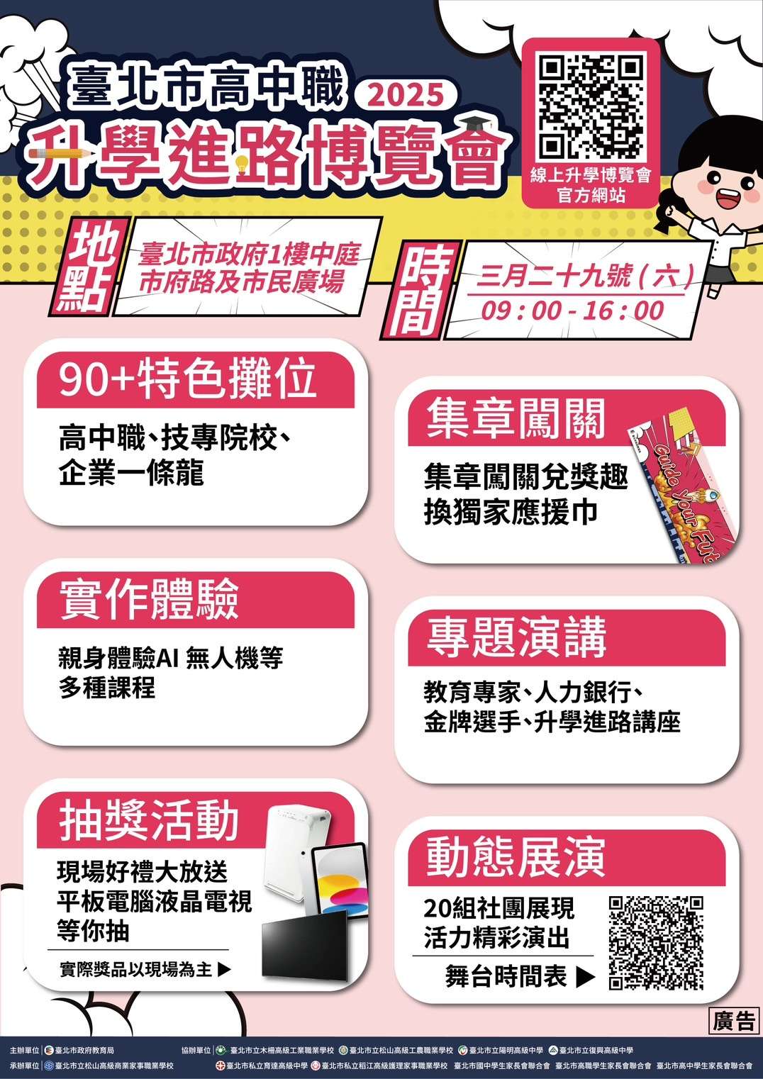 本次博覽會時間為114年3月29日(星期六)上午9時至下午4時,活動當日有交通管制,建議貴校親師生搭乘捷運、公車及Ubike微笑單車前往,交通管制路段及時間說明如下: