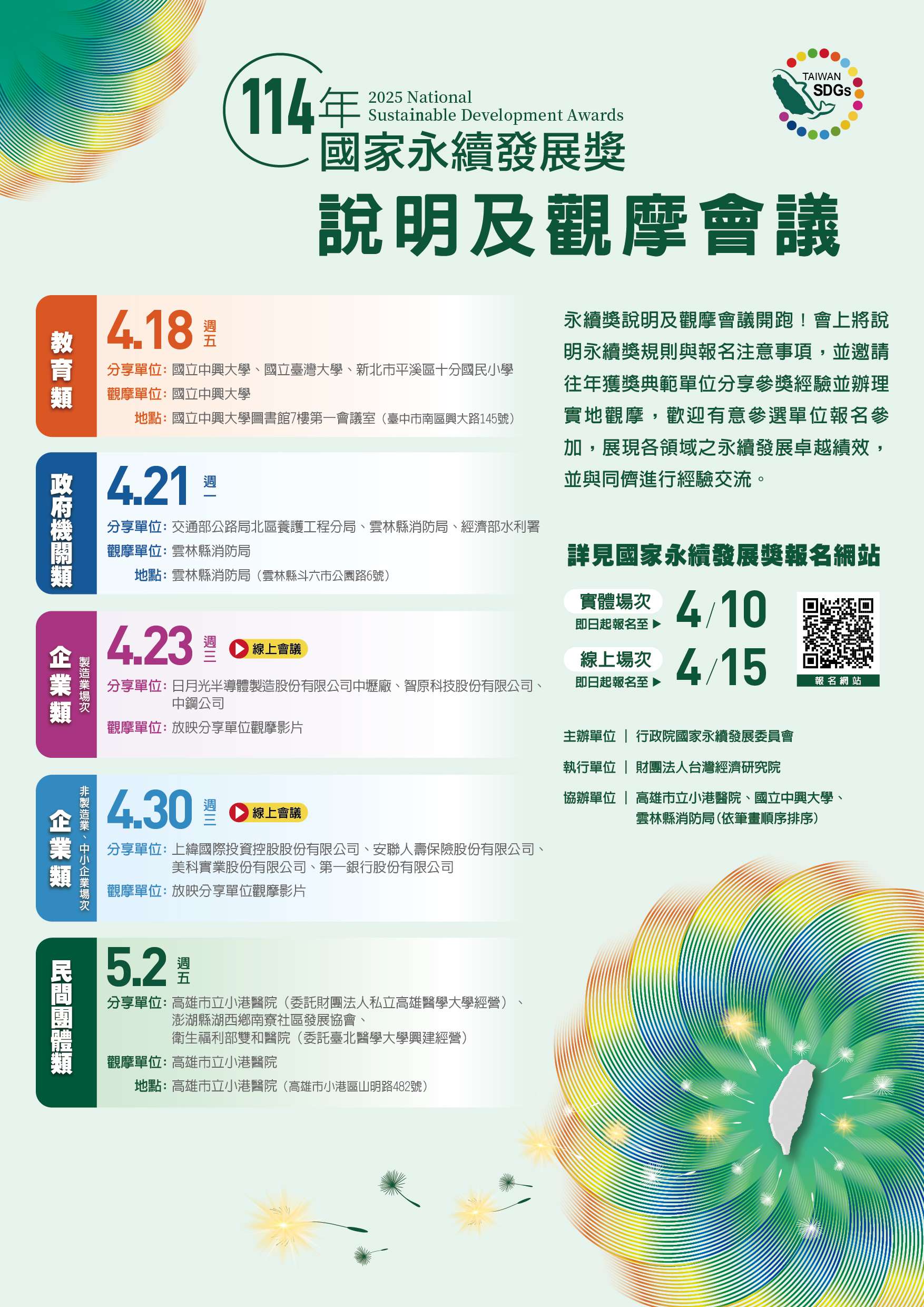 三、為增進各界對於國家永續發展獎之瞭解,並促進永續發展相關經驗互相交流與分享,行政院國家永續發展委員會另舉辦「114年國家永續發展獎說明及觀摩會議」,可免費線上報名,歡迎有意參加選拔者踴躍參加,教育類場次資訊如下: