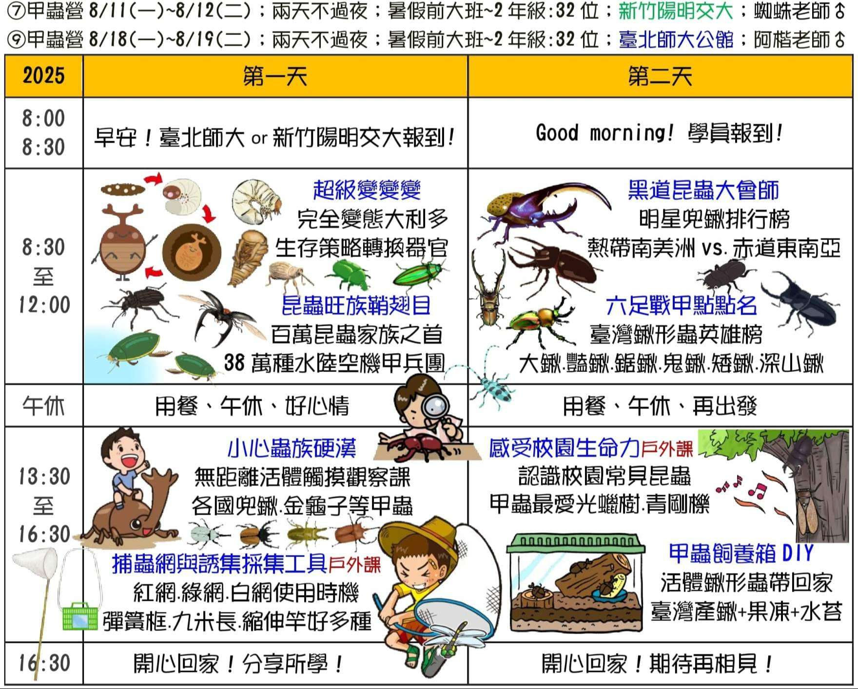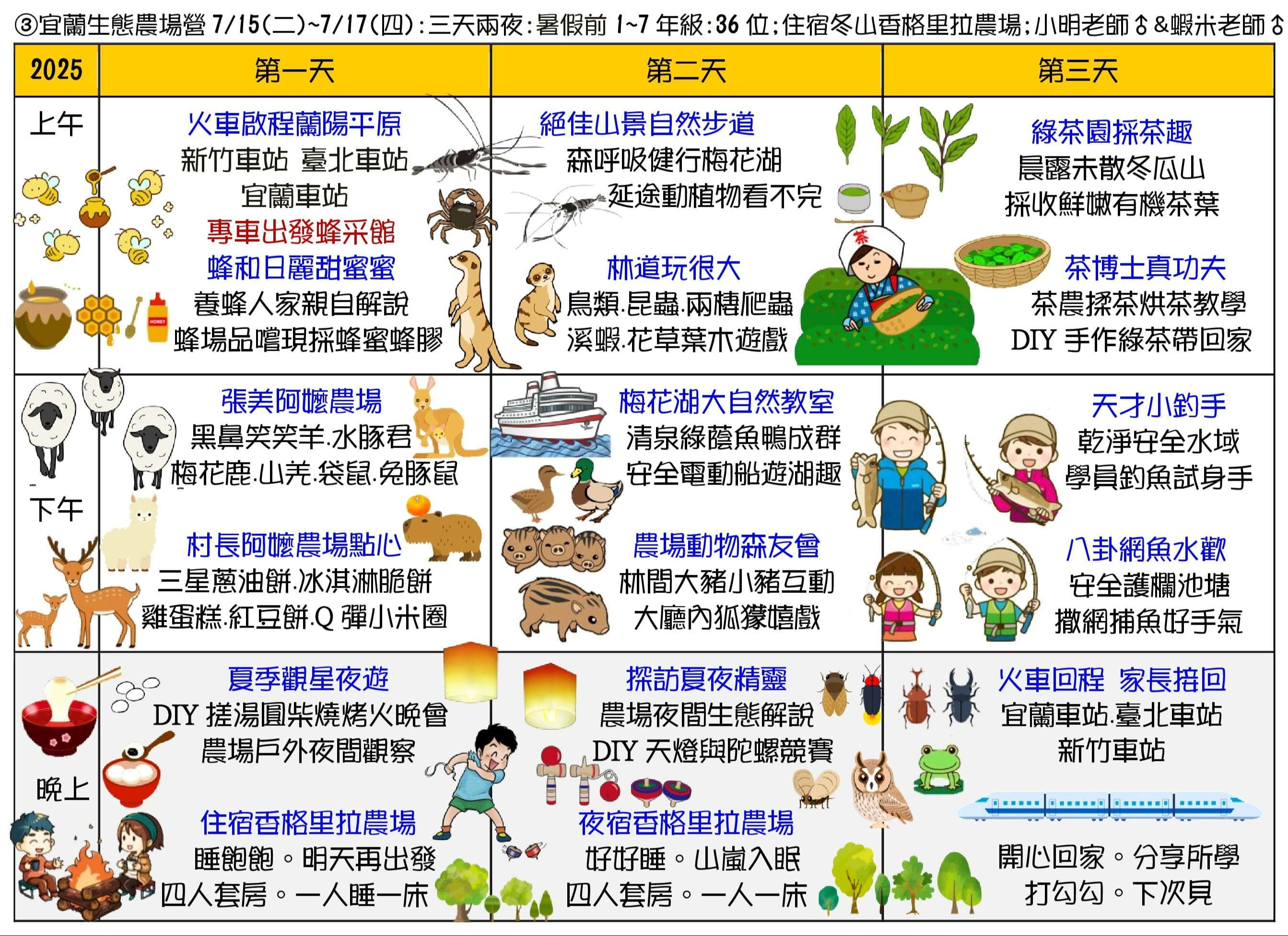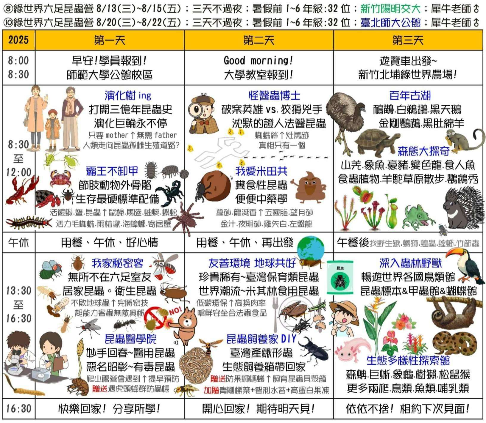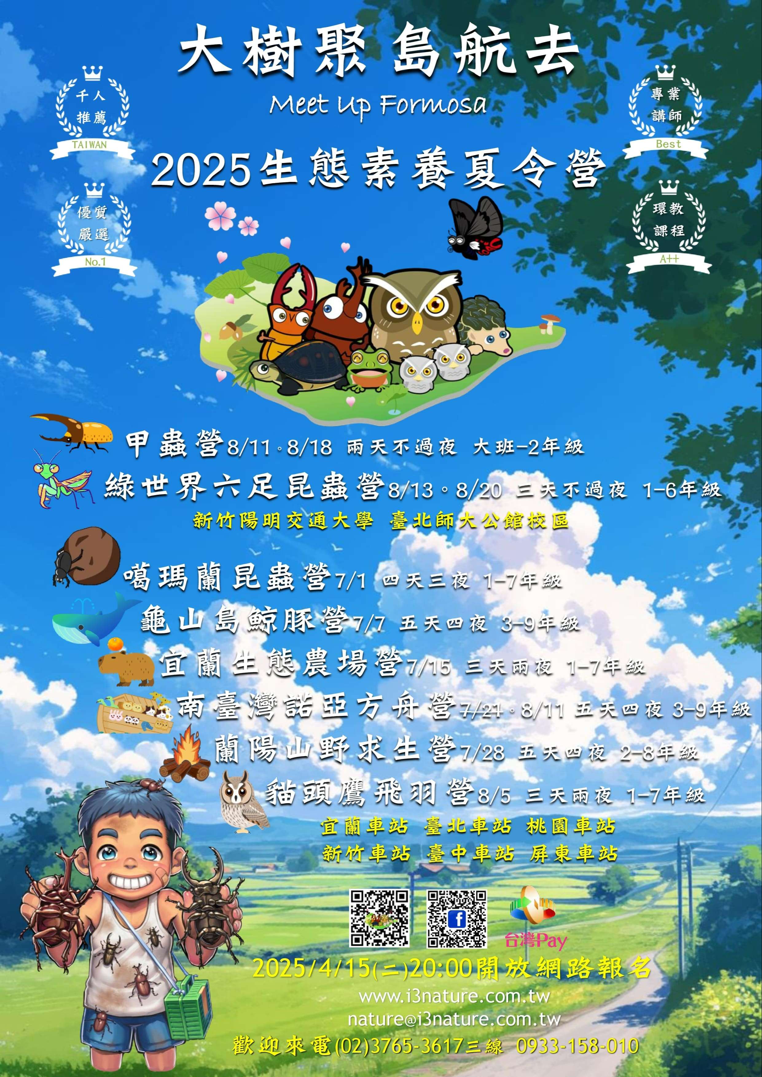 一、2025生態素養夏令營日期7/2~8/26,招生涵蓋大班-九年級學員,請依不同課程分齡參加,詳細請見營隊網站https://www.i3nature.com.tw/。