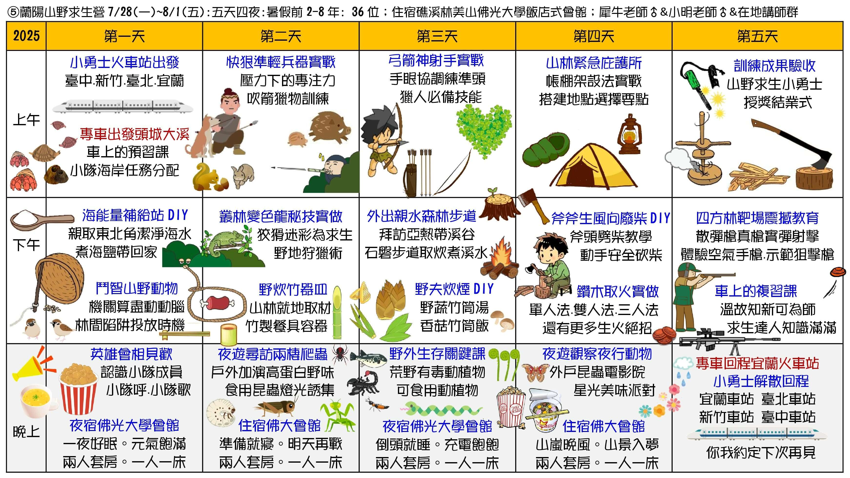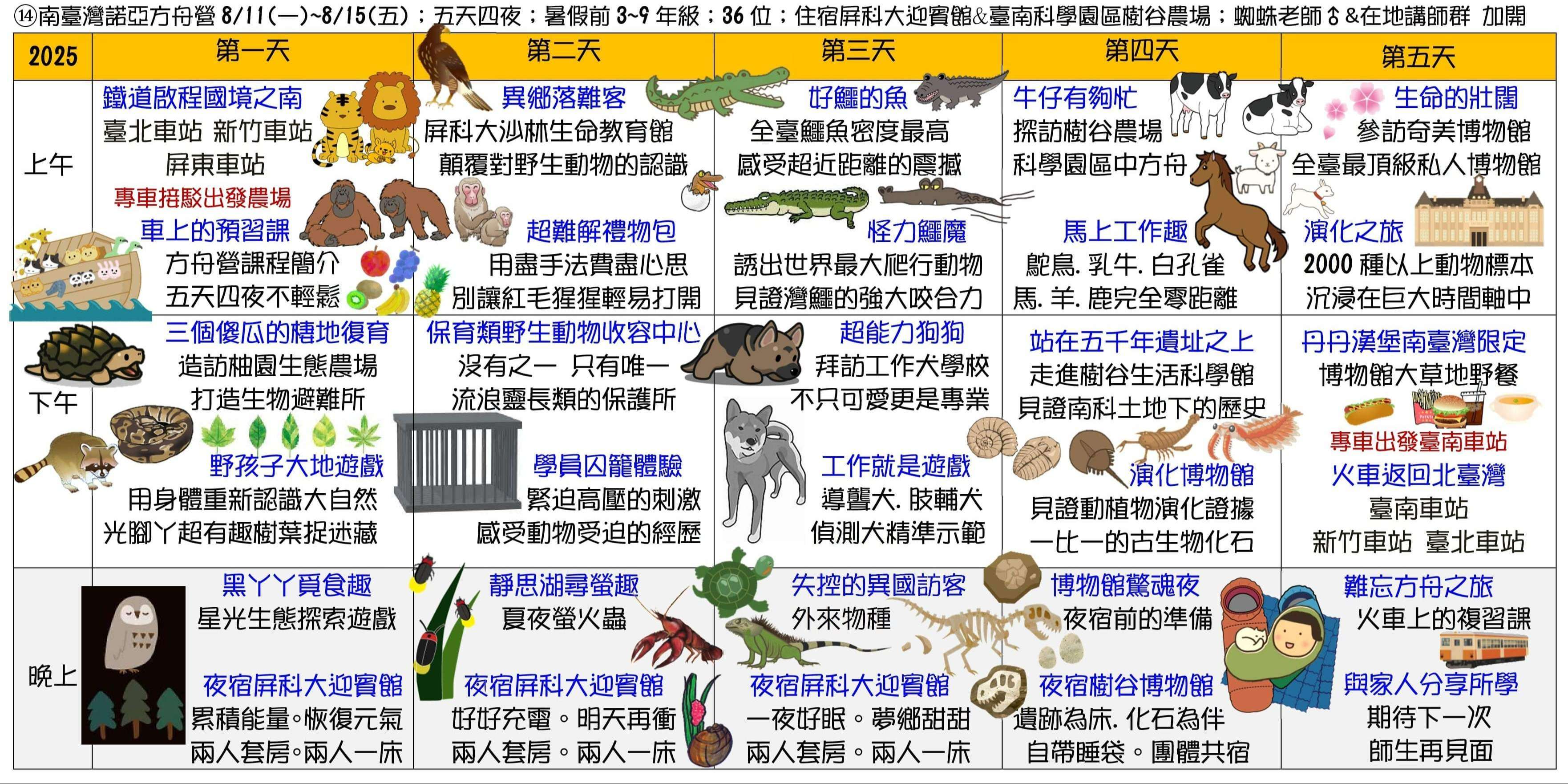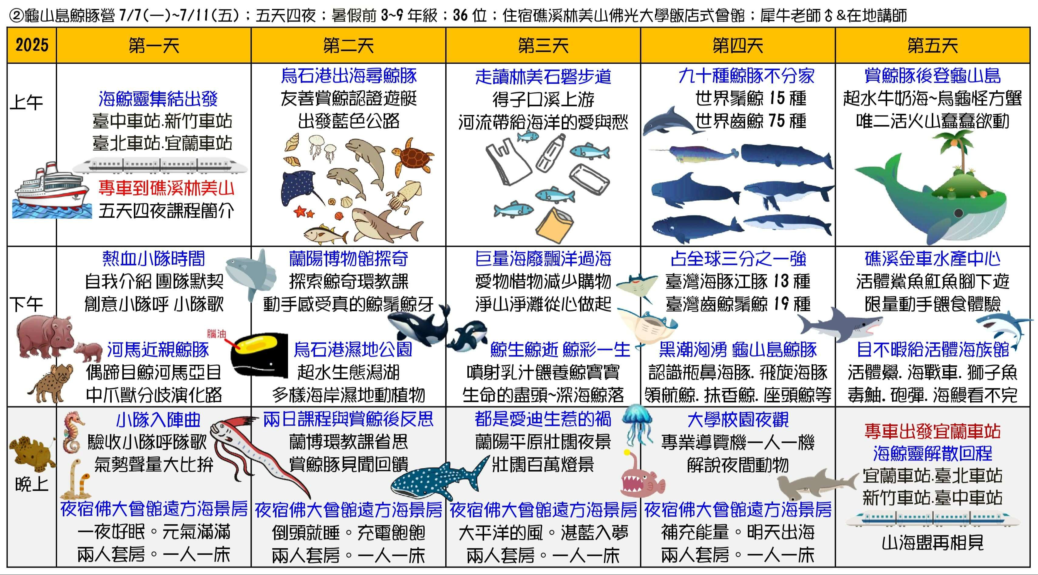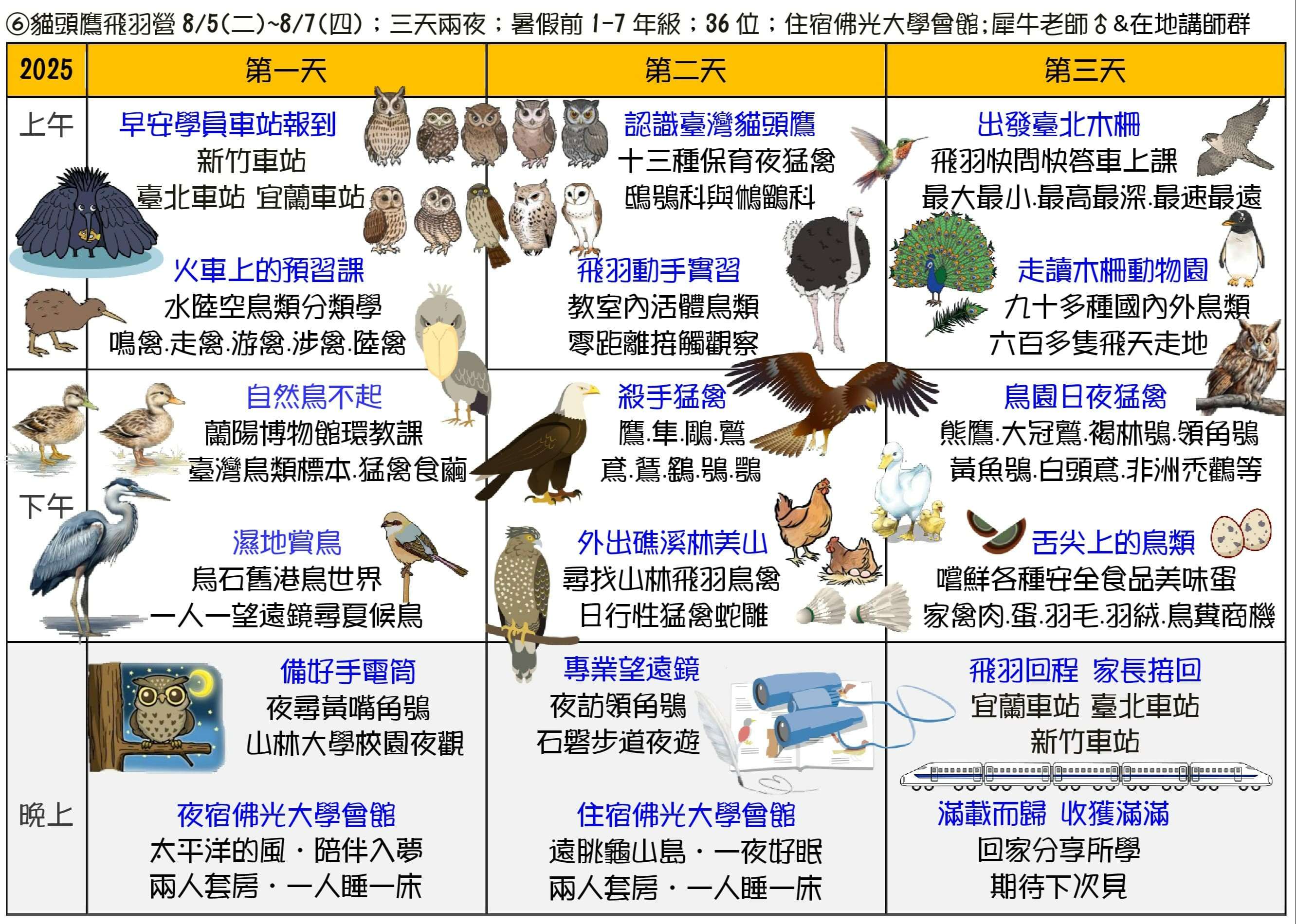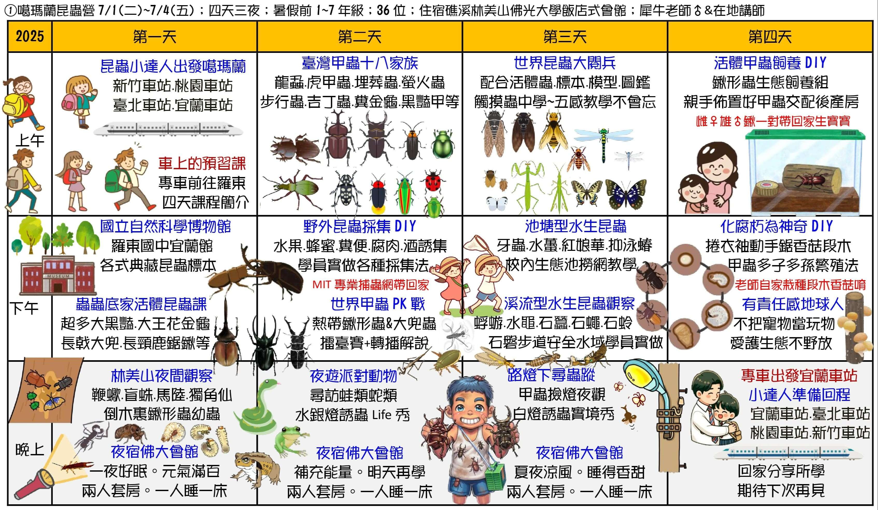 一、2025生態素養夏令營日期7/2~8/26,招生涵蓋大班-九年級學員,請依不同課程分齡參加,詳細請見營隊網站https://www.i3nature.com.tw/。
