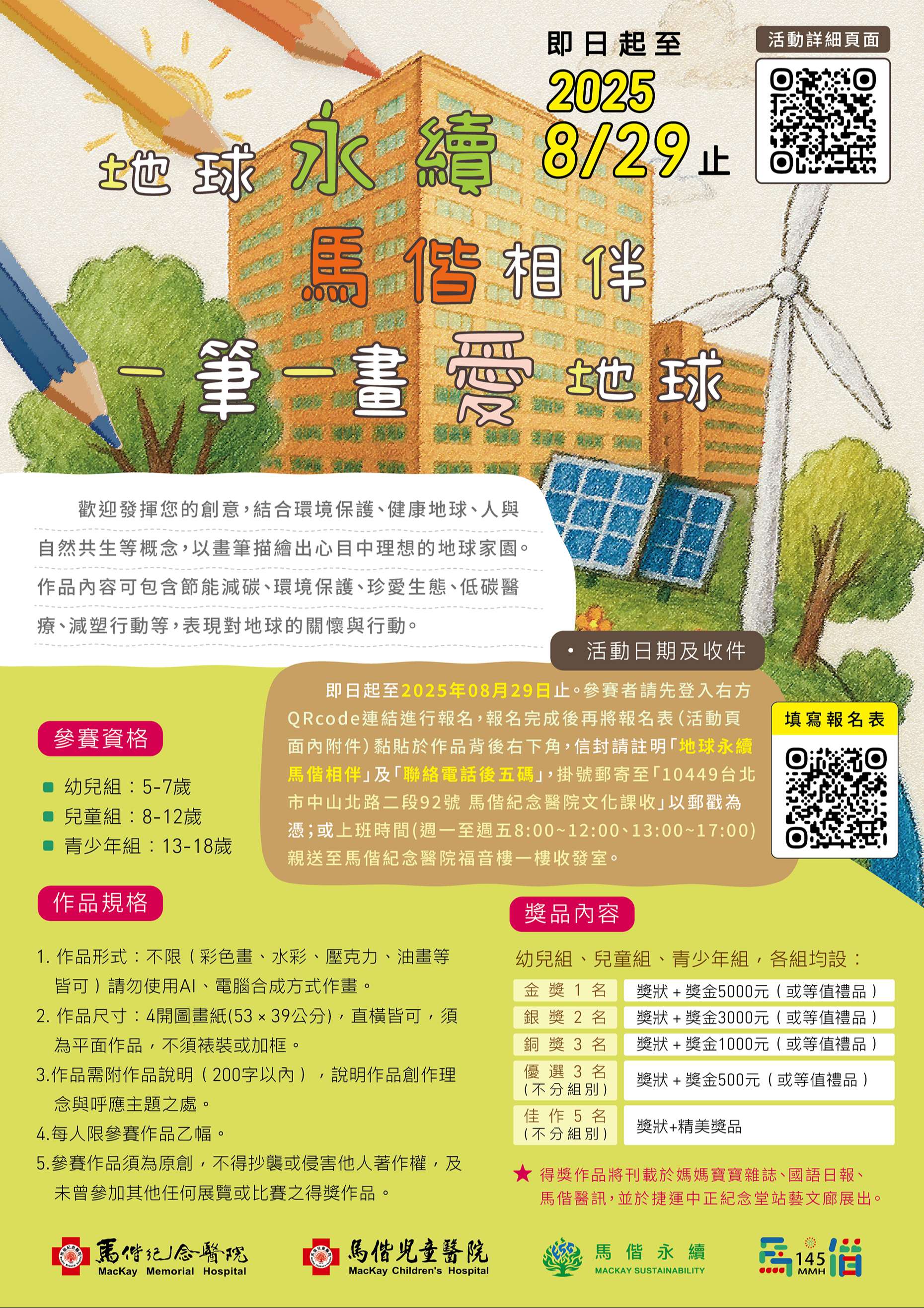 一、2025年適逢馬偕醫療體系145週年,秉持馬偕博士「寧願燒盡,不願鏽壞」的精神,我們除了關懷人的健康,也關心地球的健康。為呼應全球永續發展目標(SDGs),特舉辦「地球永續 馬偕相伴」繪畫比賽,鼓勵大小朋友透過畫筆展現守護地球的創意,發揮環保愛地球的行動力。