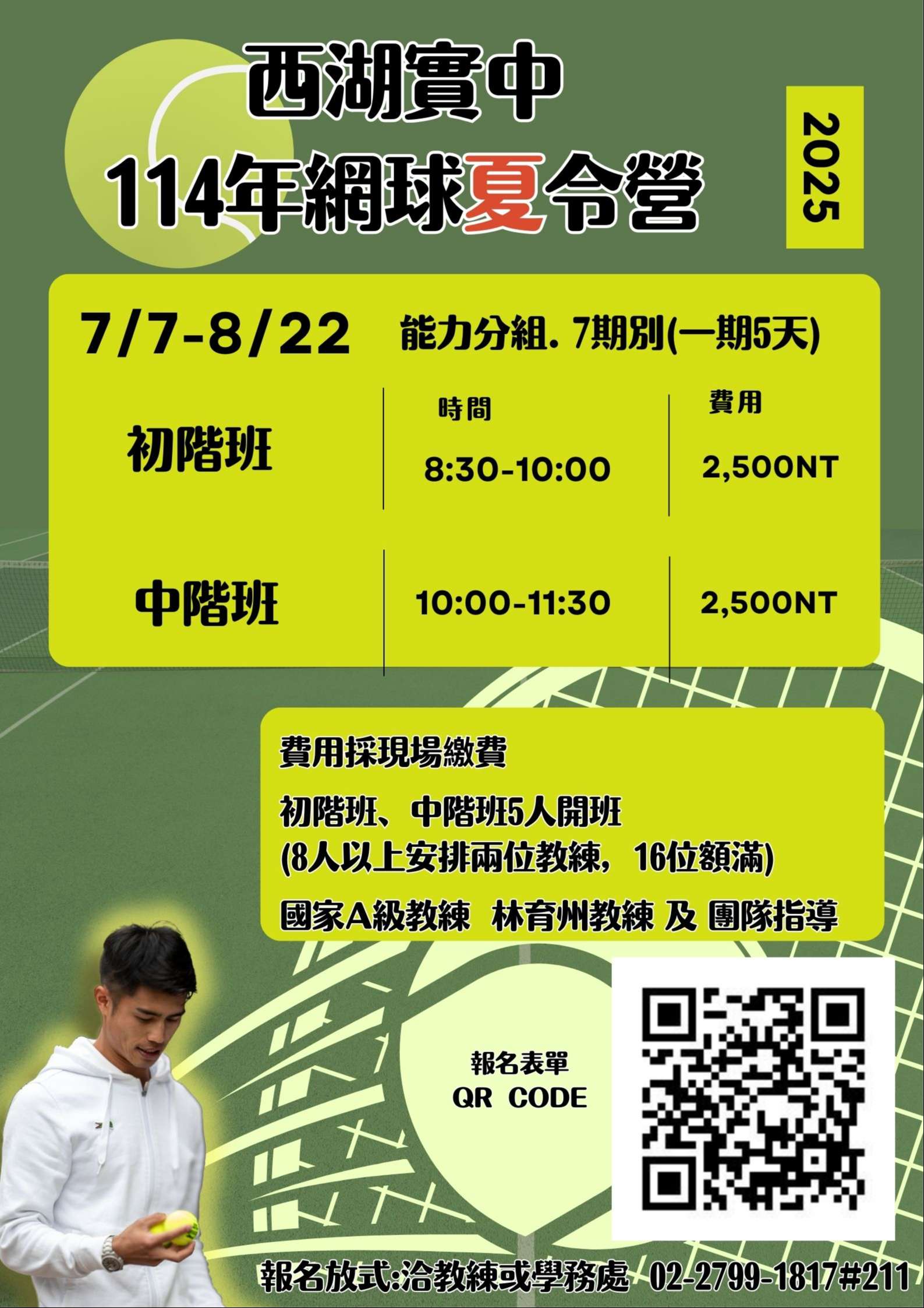 一、旨揭營隊摘要訊息如下: (一)營隊日期:114年7月7日至8月22日,每周一梯次,每梯 次五天,共計七梯次。 1、初階班,無網球經驗,學習基本動作:上午8:30- 10:00。 2、中階班,有網球經驗,可以對打練習:上午10:00- 11:30。 (二)參加對象:對網球有興趣之國小、國中七、八年級學 生。 (三)費用:每梯次2,500元。 (四)報名期間及方式:即日起至114年6月20日中午12時止, 可利用網路報名、紙本親自報名或傳真報名等方式。二、114年度網球夏令營活動實施計畫暨報名表1份。