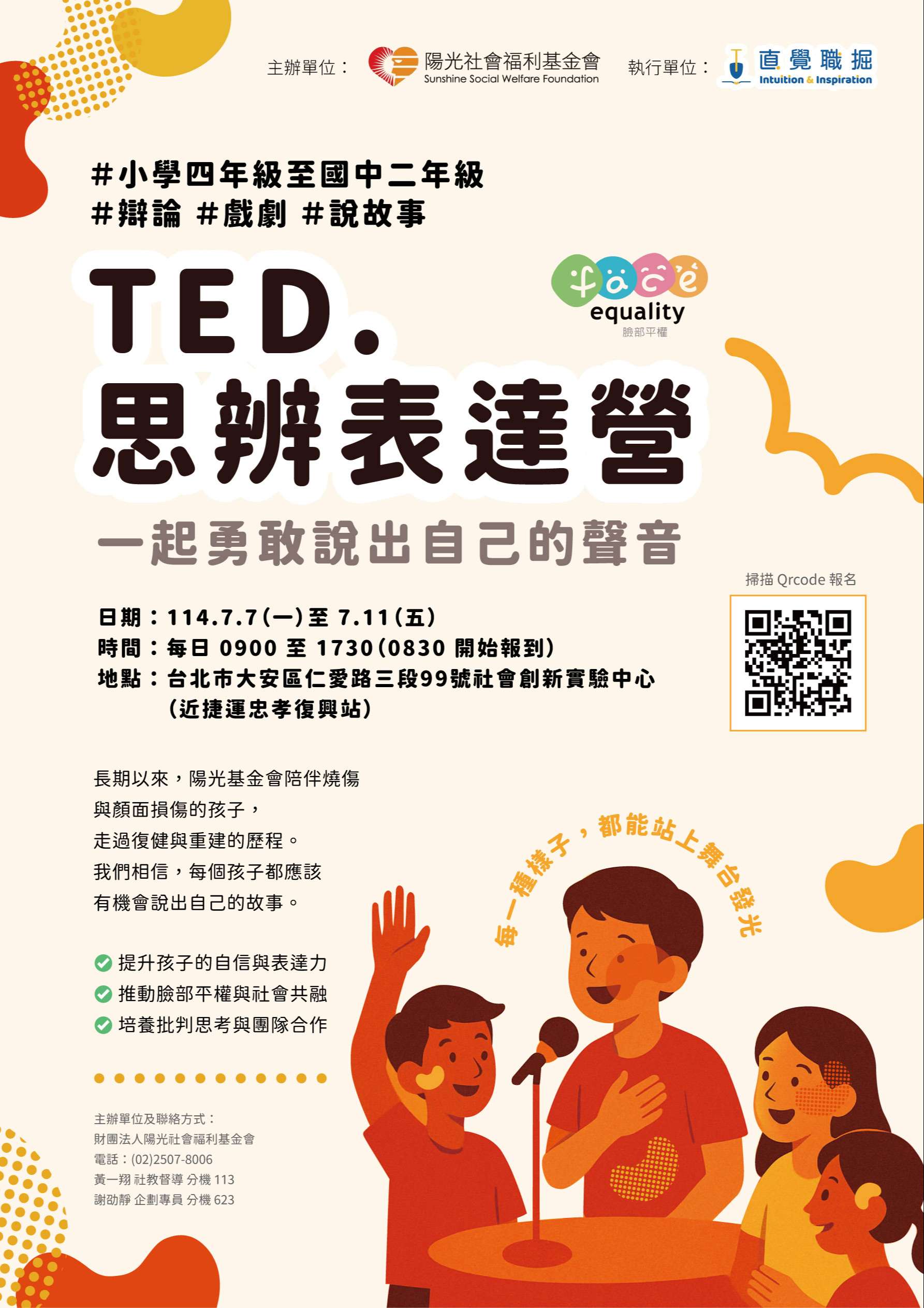 二、為使兒少能更關注日常生活中與自己、與他人相關的事物,不僅更願意表達,且能自在說出自己的想法,建立其自信、表達力與同理心,本會攜手「直覺職掘」將於7月份共同辦理「盛夏OPEN MIND 表達OPEN MIC---TED.思辨表達營」,以思辨訓練結合戲劇教育,透過小組討論、辯論演練、街訪實作與舞台發表,引導兒少勇敢發聲、理解多元,並從中認識容貌焦慮與外貌歧視等議題。