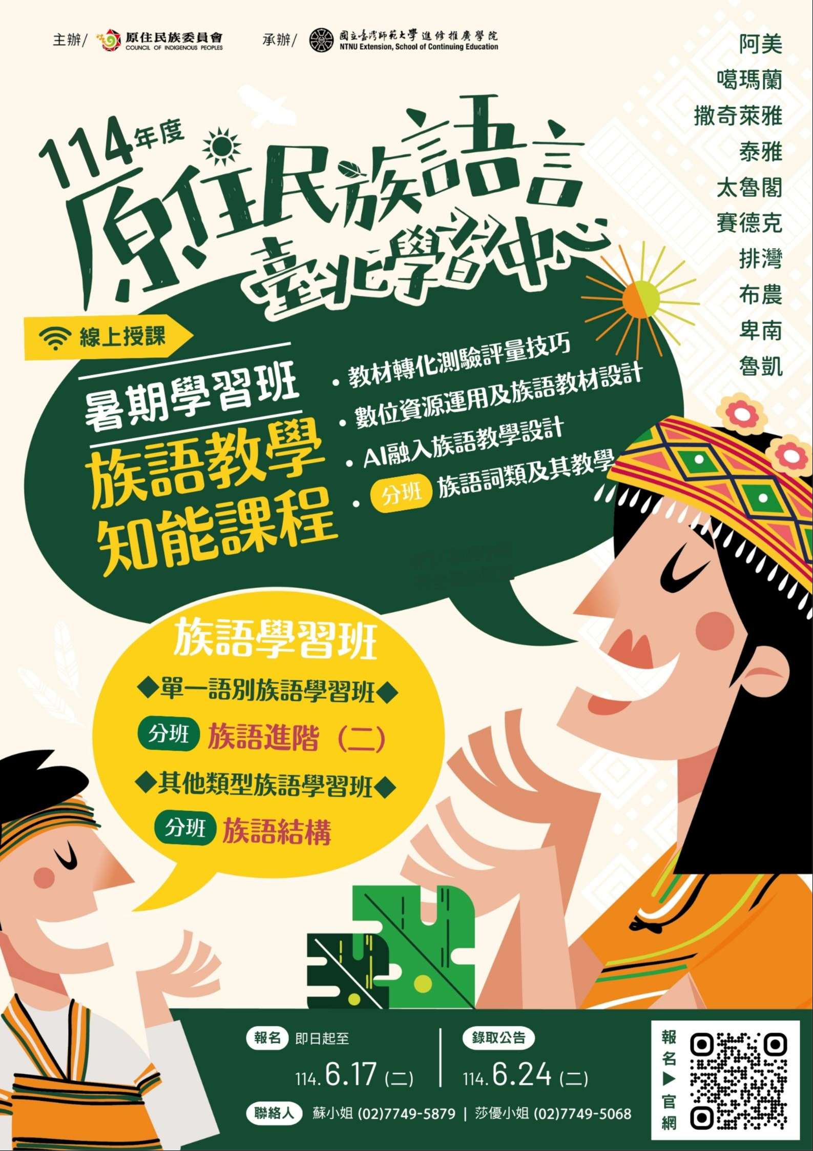 為協助強化原住民族語言師資教學專業知能,期有效提升原住民族語言教學質與量,並強化族語傳承與發展之深度與廣度,國立臺灣師範大學於114年度持續辦理旨揭專班。