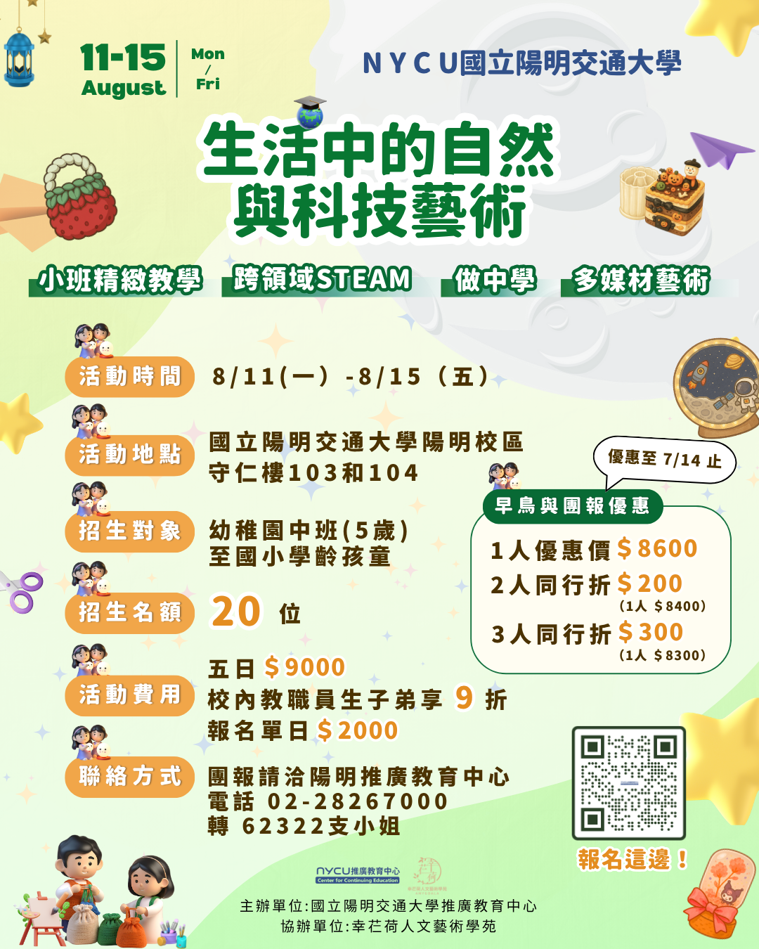 一、本校推廣教育中心將於114年暑期辦理「生活中的自然與科技藝術」兒童課程,引導孩童探索自然科技與藝術創作的樂趣。