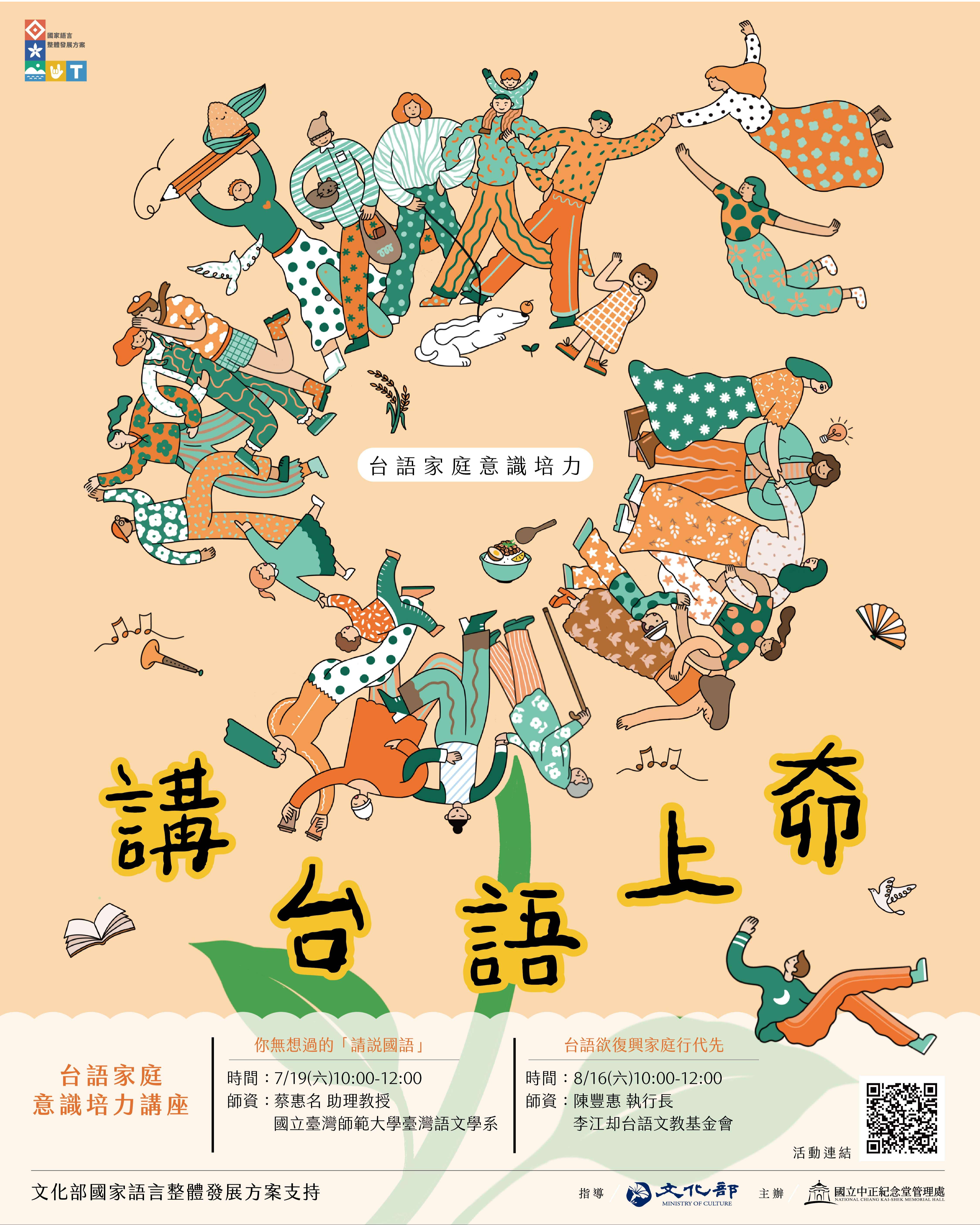 各課程配合文化部「培育台語家庭計畫」集點,歡迎台語家庭參與學習;且講座課程可依參與時數核發公務人員終身學習時數,詳情請洽國立中正紀念堂管理處官網(https://www.cksmh. gov.tw/),查詢路徑如下:官網/推廣教育/國家語言推廣活動。