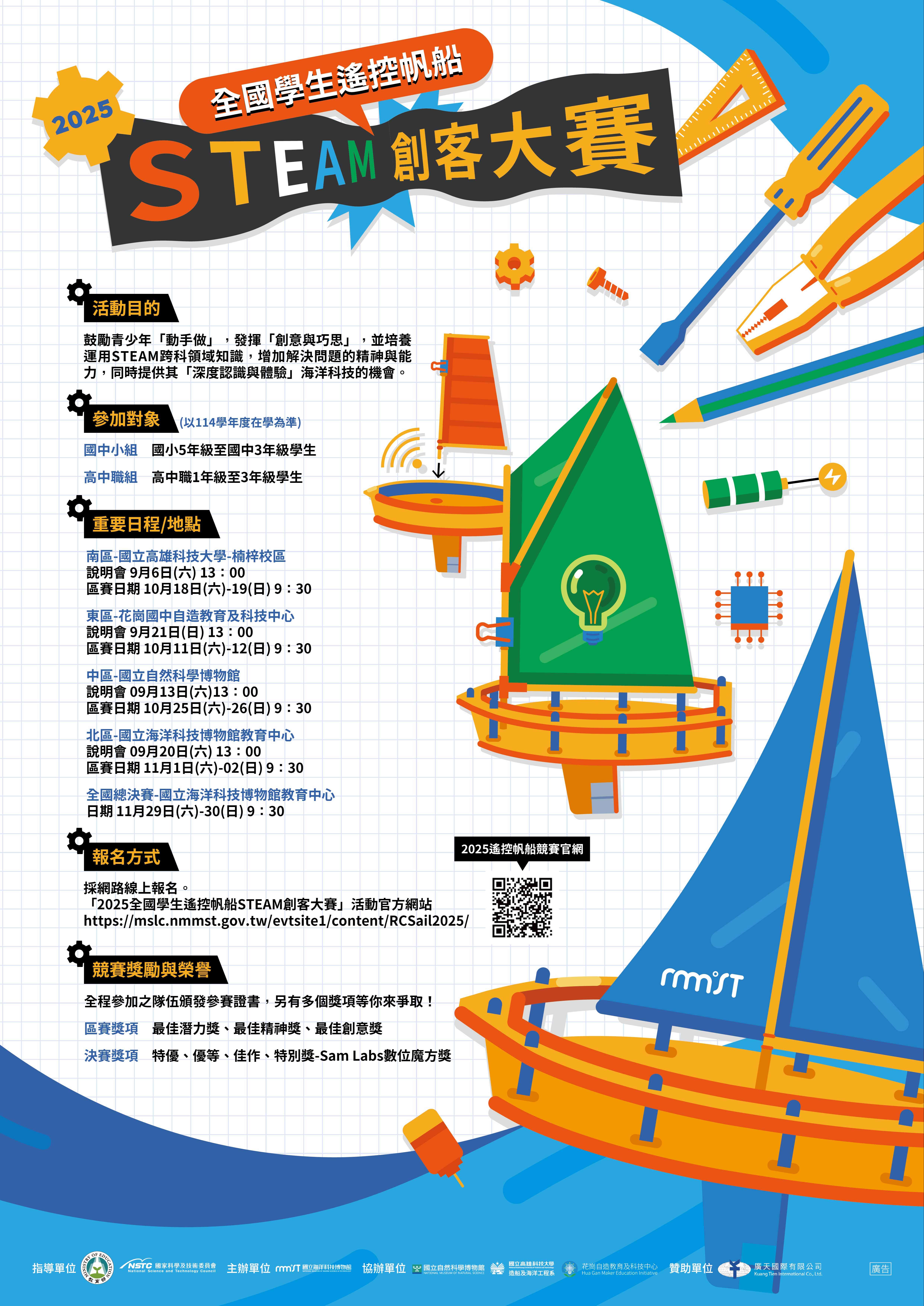 四、活動詳情與報名請參閱活動簡章,或至「2025全國學生遙控帆船STEAM創客大賽」活動官網https://mslc.nmmst.gov.tw/evtsite1/content/RCSail2025/