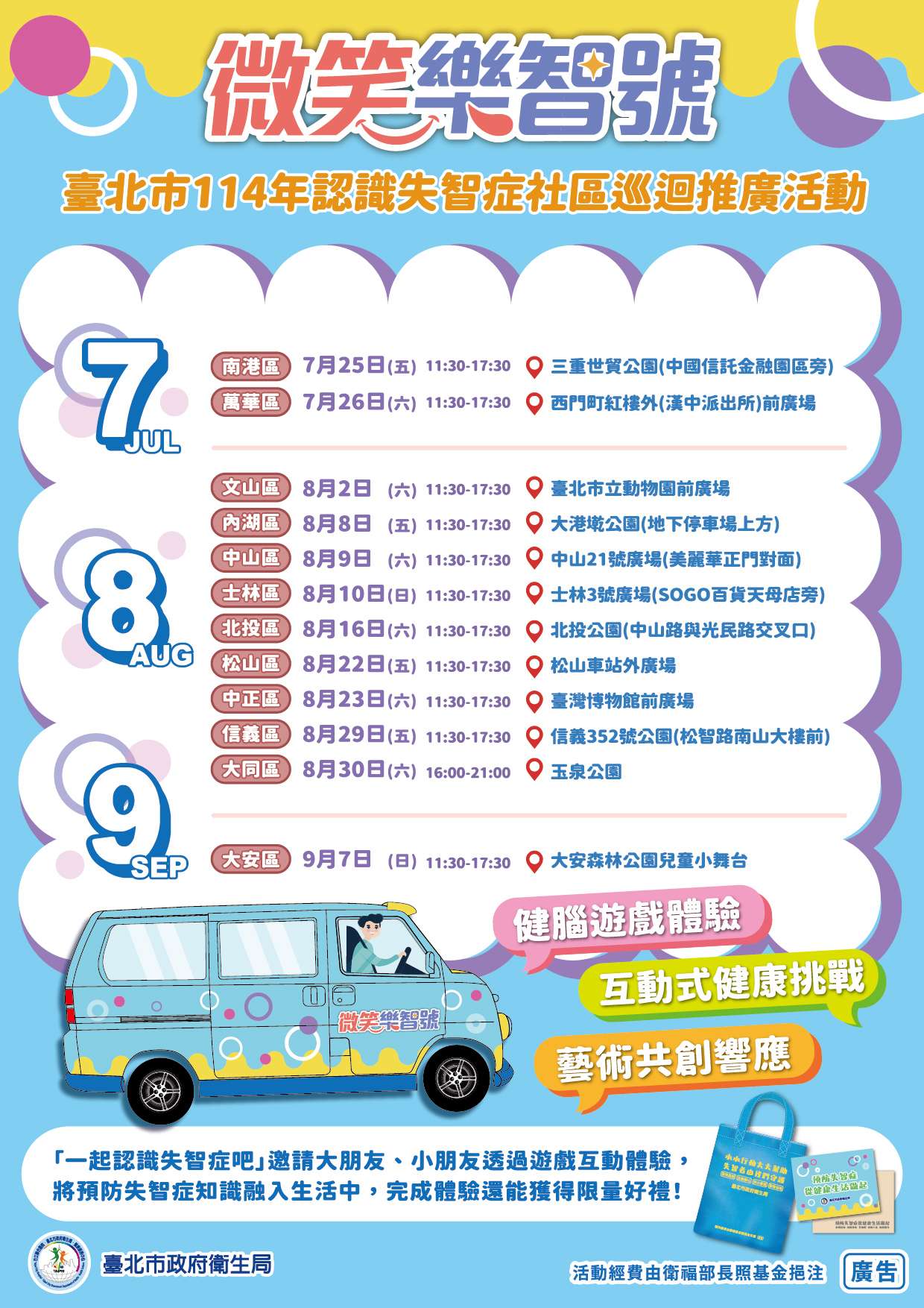 7/25~9/7 巡迴臺北12場次#微笑樂智號 胖卡深入社區💪推廣失智症知識融入生活!📢邀請全家大小一起來參加