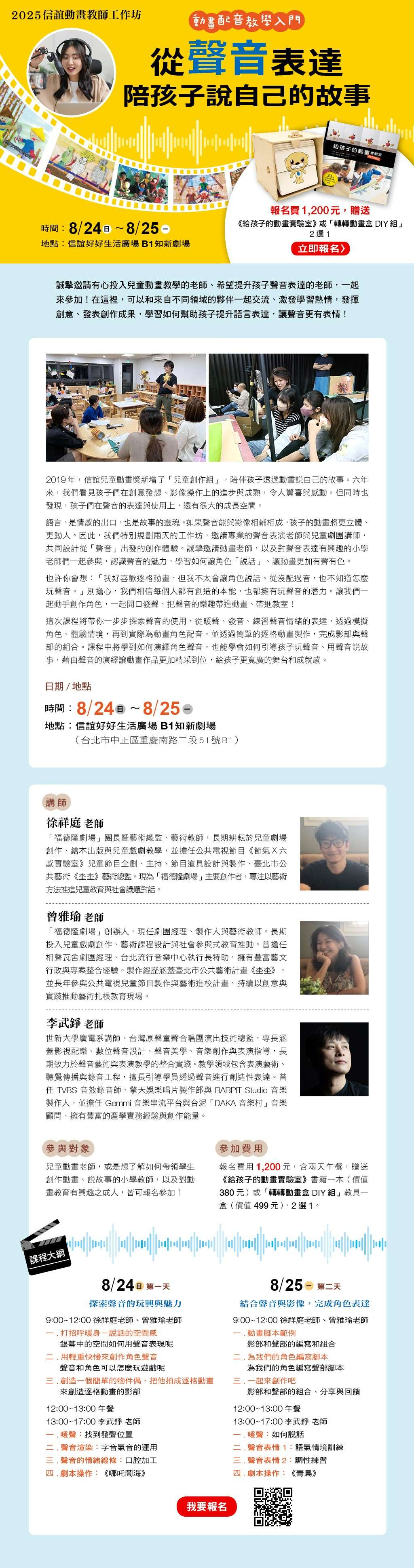 二、本次工作坊以「動畫配音教學入門」為主題,聚焦於聲音表達與動畫創作的結合,邀請具備劇場、配音、聲音藝術背景之專業師資,設計兩日豐富課程,協助教師探索聲音表演的教學可能。