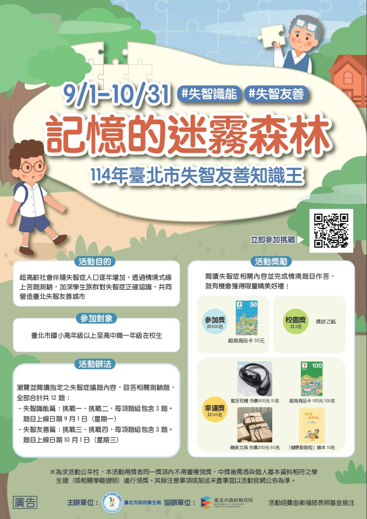 一、超高齡社會伴隨失智症人口逐年增加,本局辦理旨揭活動,透過情境式線上答題測驗,加深學生族群對失智症認識,共同營造失智友善環境,活動資訊摘述如下: