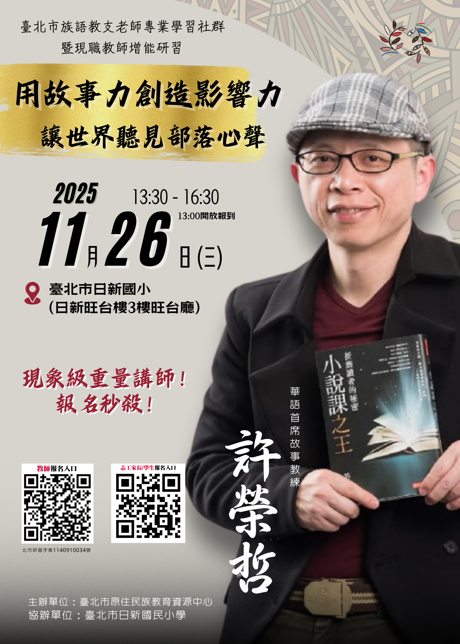 (五)參加對象:對「故事力」教學與原住民族教育有興趣之本市各級學校現職教師、本土語老師(含支援教師)、志工家長及師培學生等。