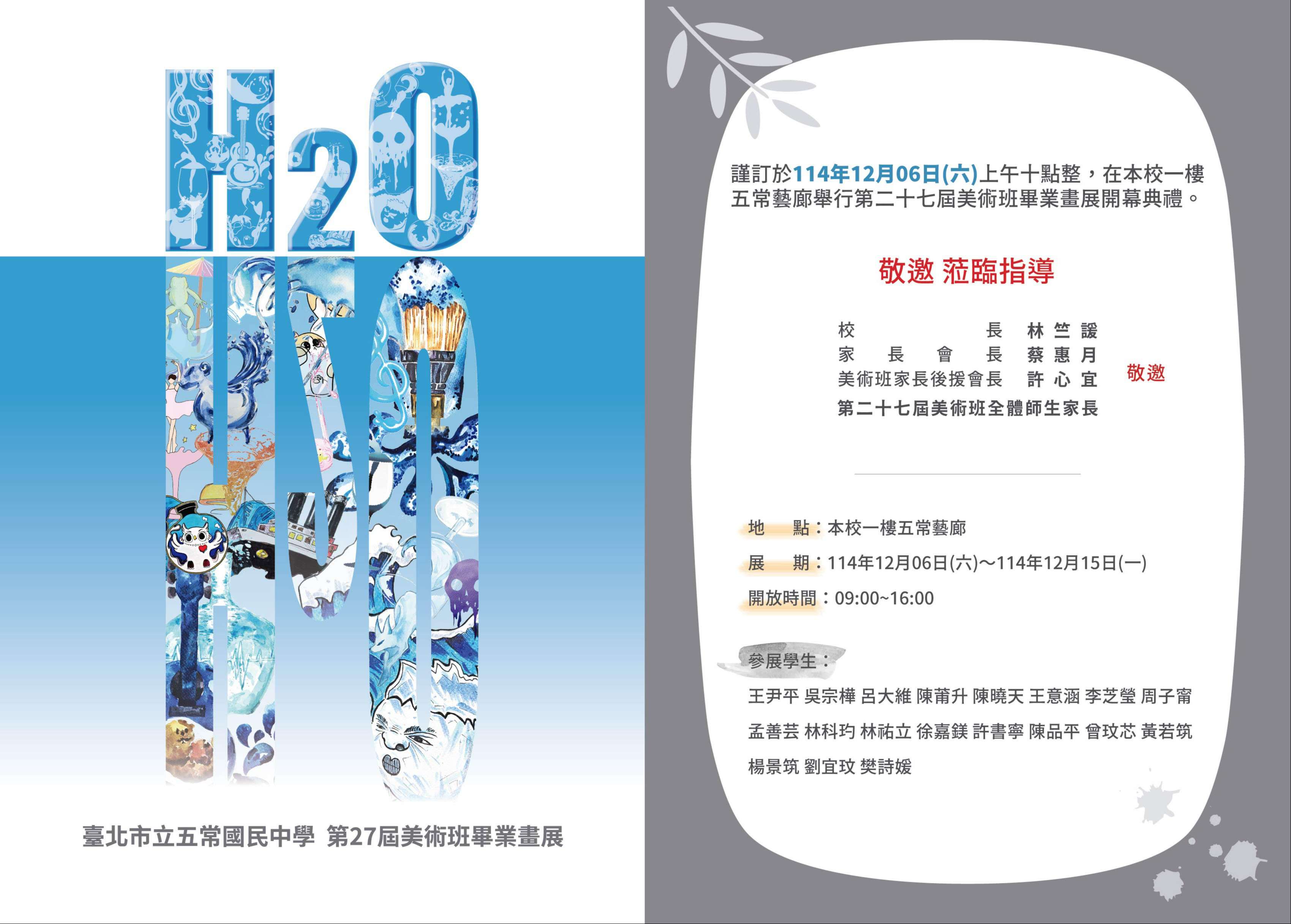 一、謹訂於114年12月6日(星期六)舉行本校第27屆美術班 「H2O」畢業畫展活動,開幕典禮為上午10時舉行,歡迎各界貴賓共襄盛舉。