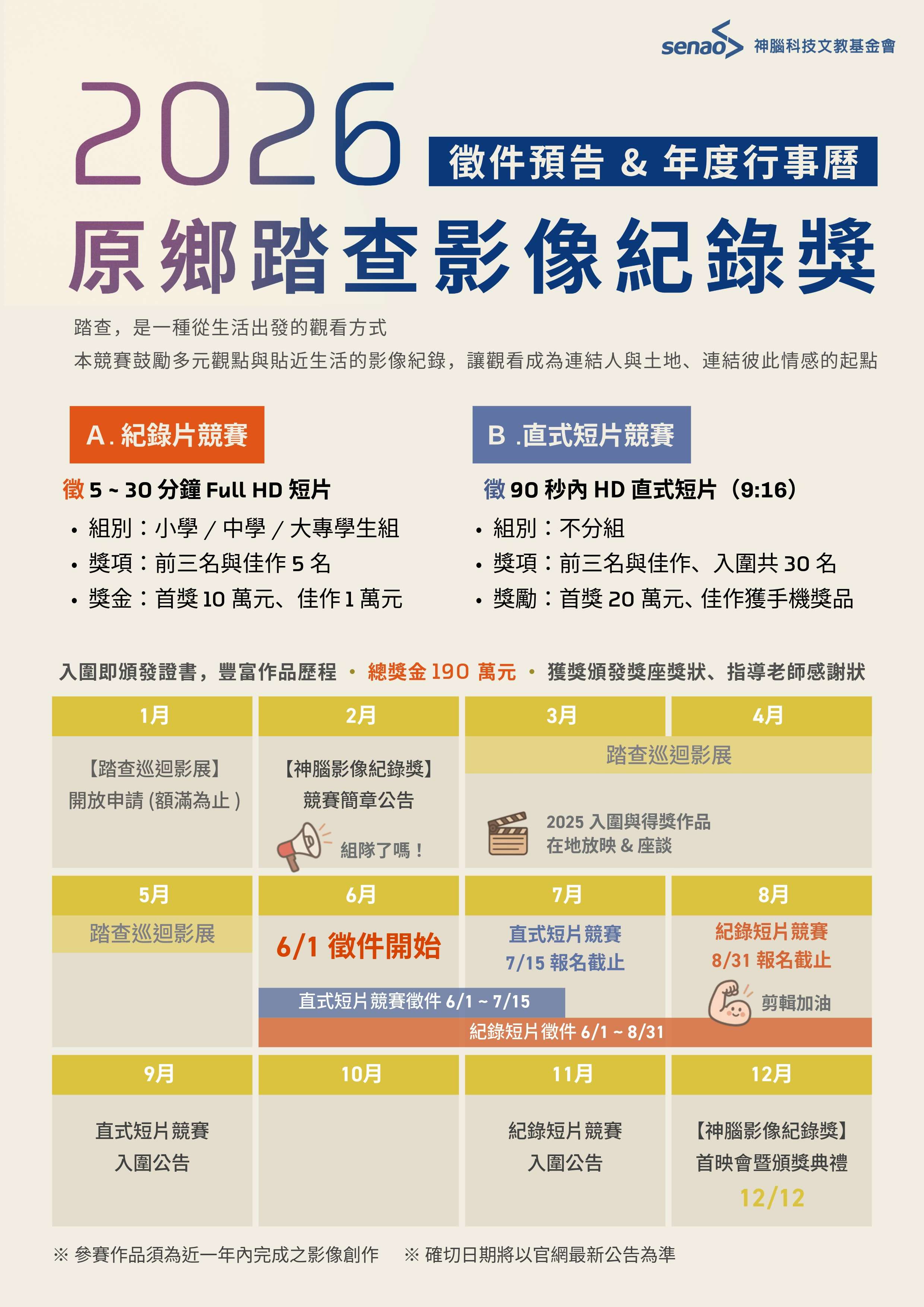 五、另本會預計於 115 年 6 月 1 日起辦理「2026 神腦原鄉踏查影像紀錄獎」徵件。本屆徵件包含: