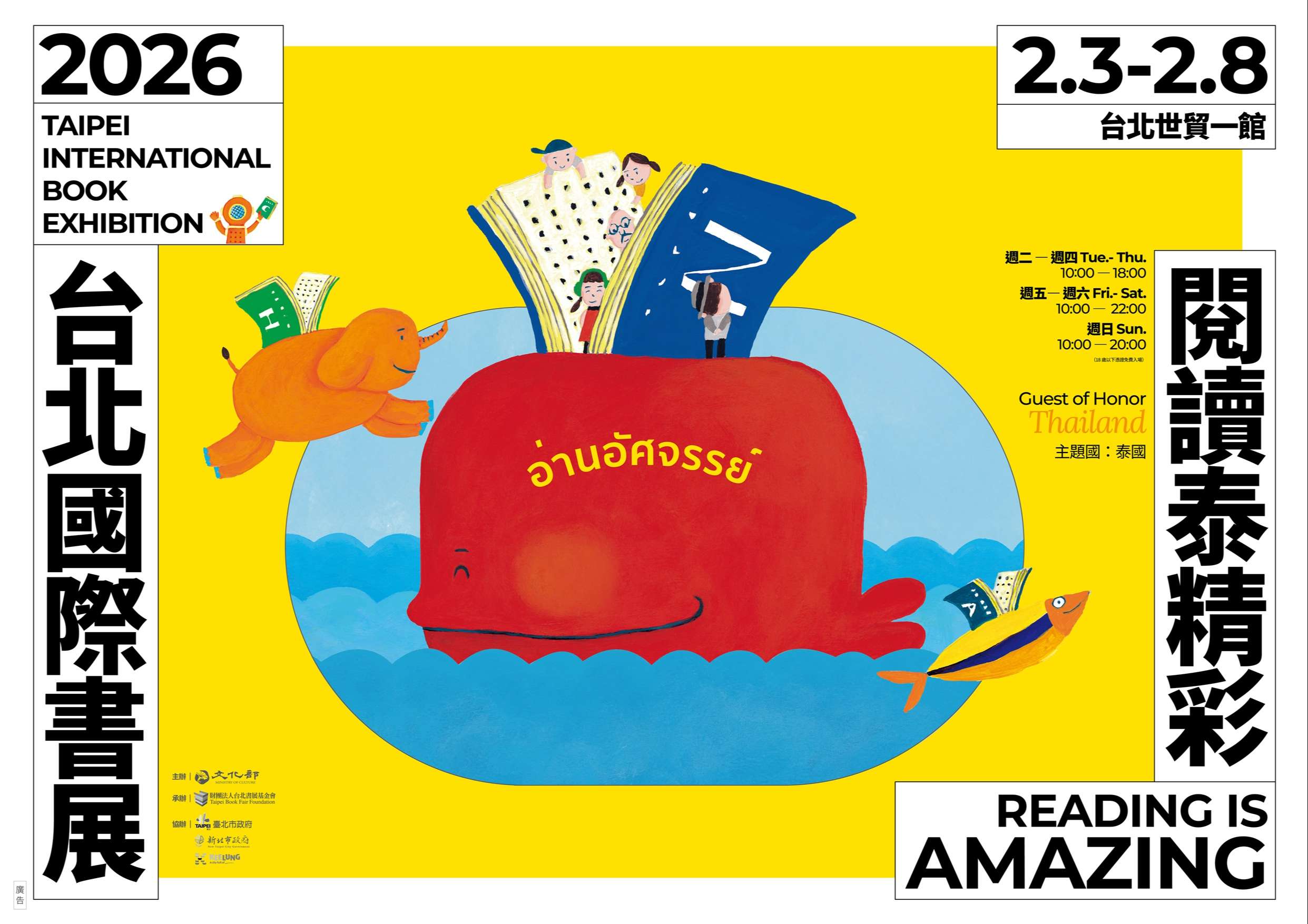 一、旨揭活動係由文化部主辦,財團法人台北書展基金會承辦,由本府擔任協辦單位,將於今(115)年2月3日至2月8日假台北市世貿中心展覽一館舉辦,以「閱讀泰精彩,Reading is Amazing」為主題,主題國為「泰國」。活動詳情請至台北國際書展官網查詢