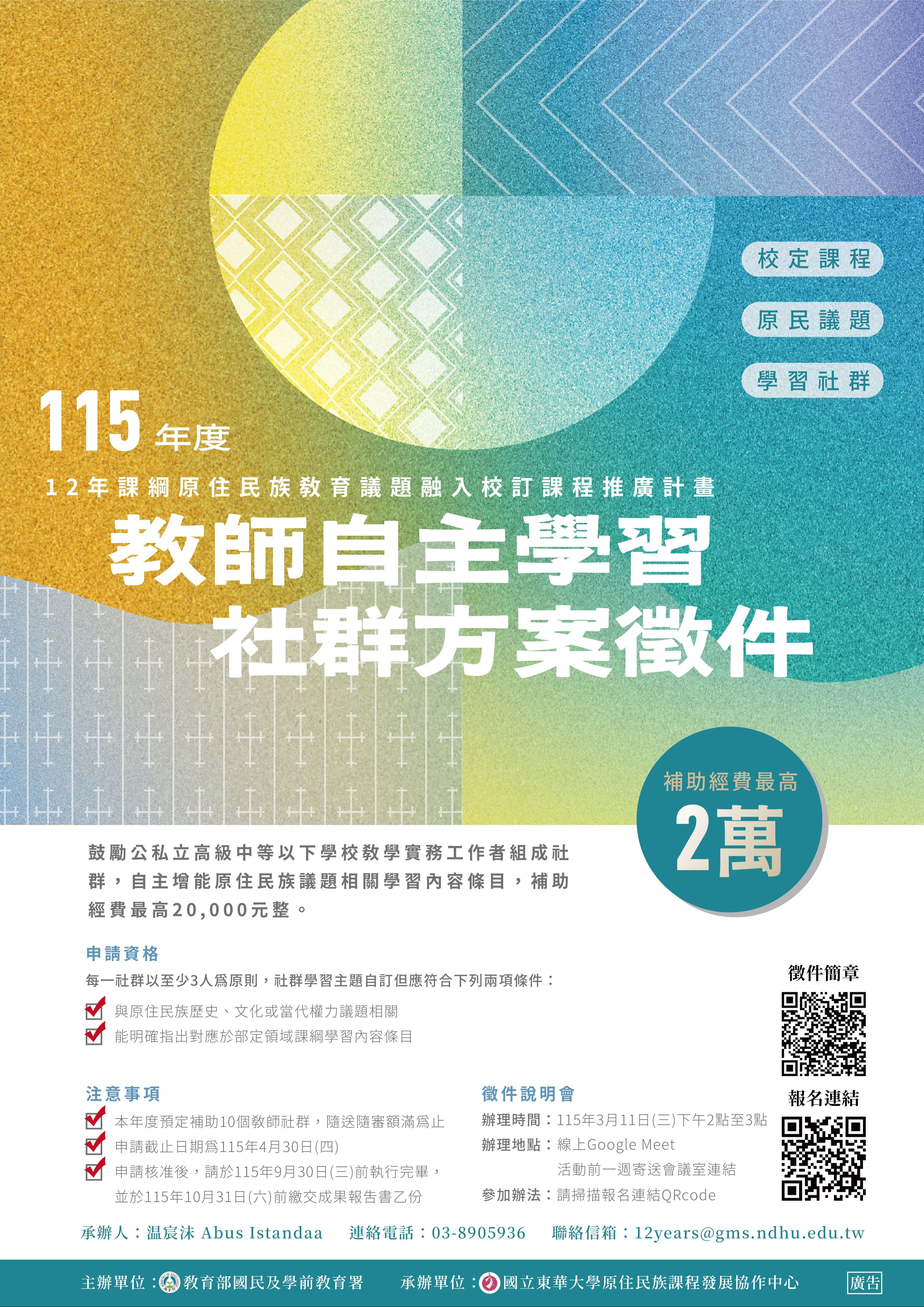 因應十二年國教課綱正式實施,為協助教師及學校落實原住民族議題融入各學習領域及課程,爰辦理旨揭方案,補助教師組成學習社群,進行相關學習內容之自主增能,以提升教師對原住民族教育議題之理解,並推動全民原住民族教育理念之落實。
