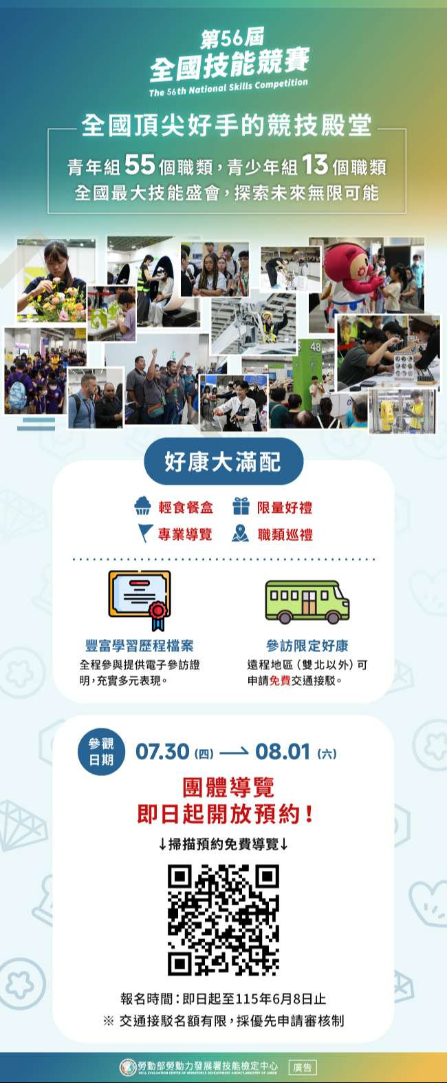 轉知勞動部勞動力發展署技能檢定中心辦理「第56屆全國技能競賽」活動資訊,活動將於115年7月29日(星期三)至8月2日(星期日)假臺北南港展覽館1、2館舉行,競賽日程為7月30日至8月1日,歡迎有興趣之師生踴躍參訪。