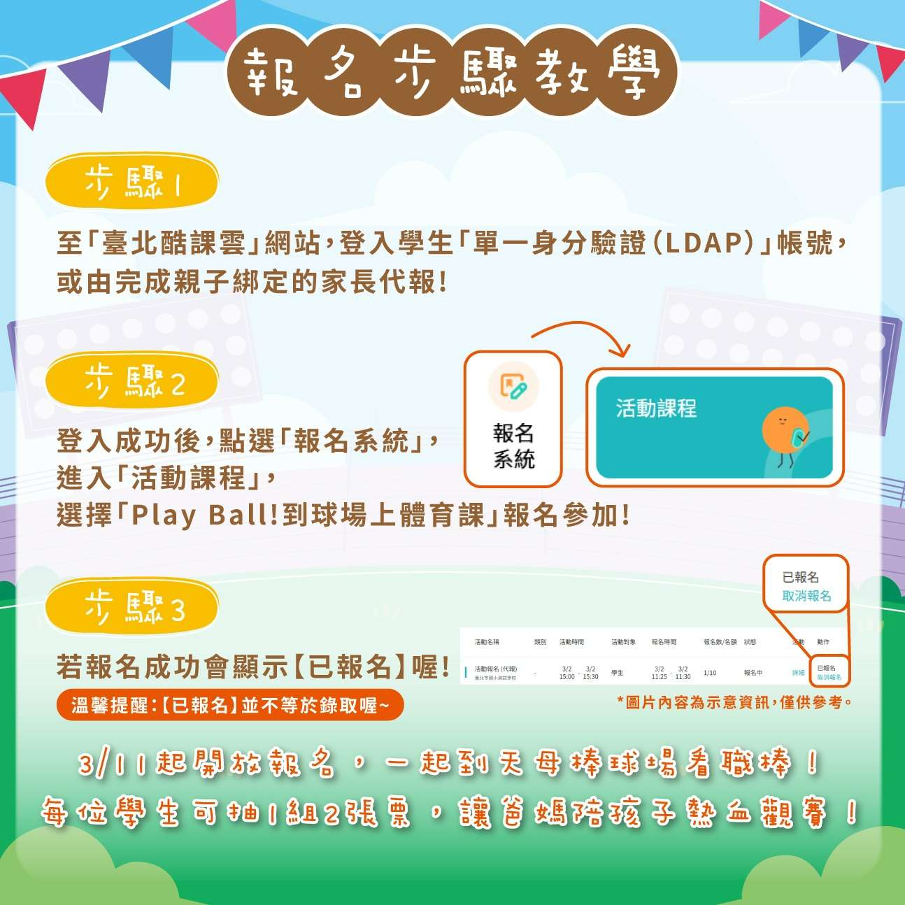 二、本計畫重點摘要如下: (一)對象:本市114學年度公私立國民小學在學學生。 (二)場次:115年4月3日至4月7日、4月28日及4月29日,共計 7場次,地點為臺北市立天母棒球場。 (三)報名方式:一律採「酷課 APP」或「酷課雲」線上報 名。家長須完成親子綁定,或學生使用單一身分驗證帳 號登入。 (四)報名期程:第一階段自115年3月11日(星期三)上午9時至3月15日(星期日)下午4時止。