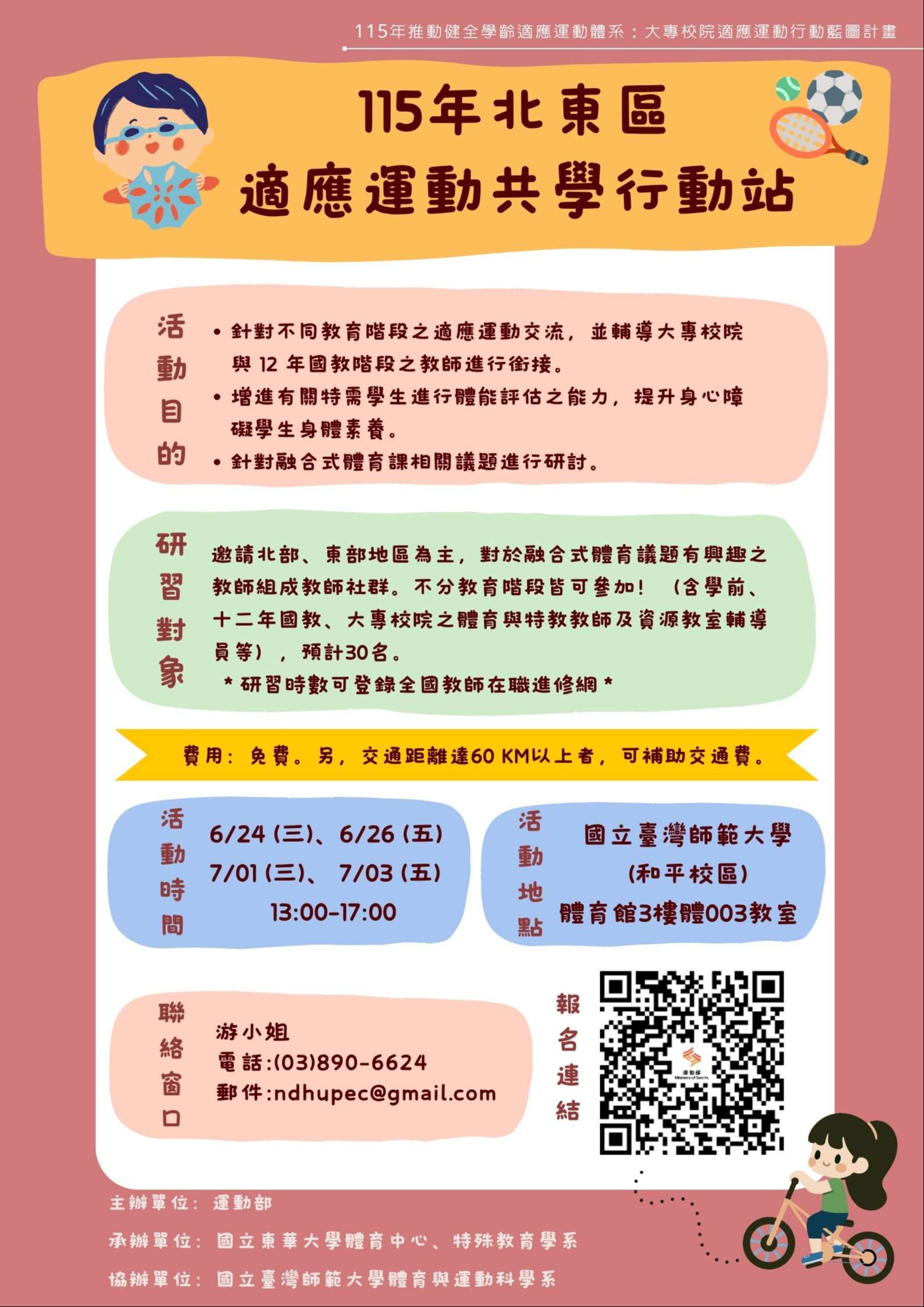 三、本案如有相關詢問事項,請洽詢東華大學專案助理:游小 姐(電話:03-8906624、電子信箱:ndhupec@gmail. com)。