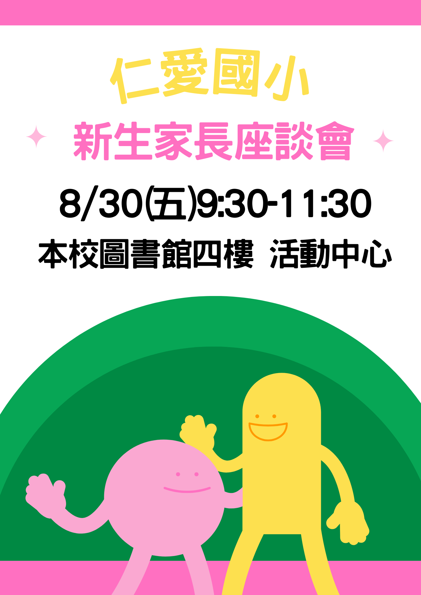 敬愛的新生家長好,歡迎孩子進入仁愛國小大家庭,開學日為8月30日(五),上午7:30-7:50請孩子穿著制服直接至各班教室報到,若您計畫陪伴孩子入校,當日各項活動流程如下: