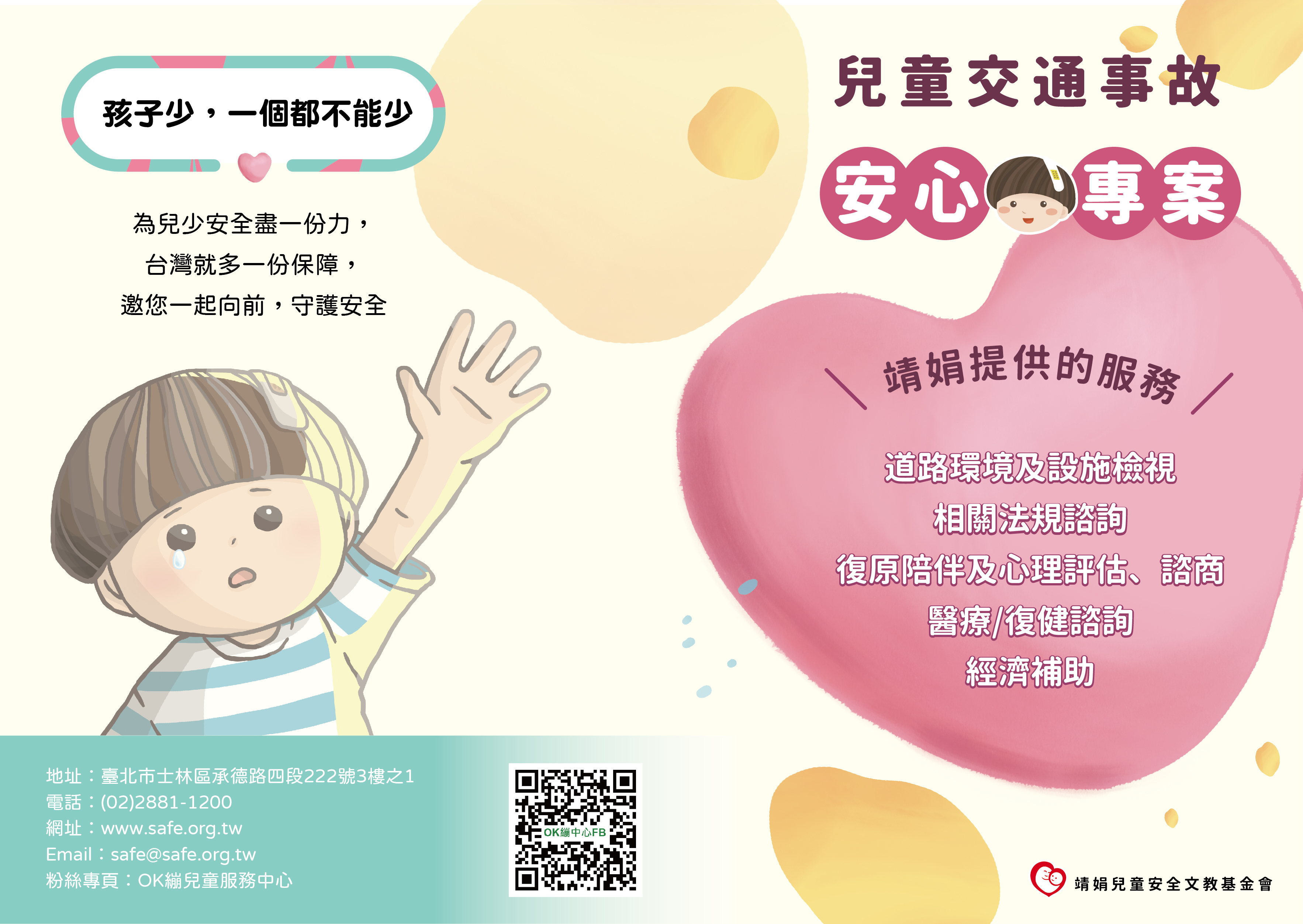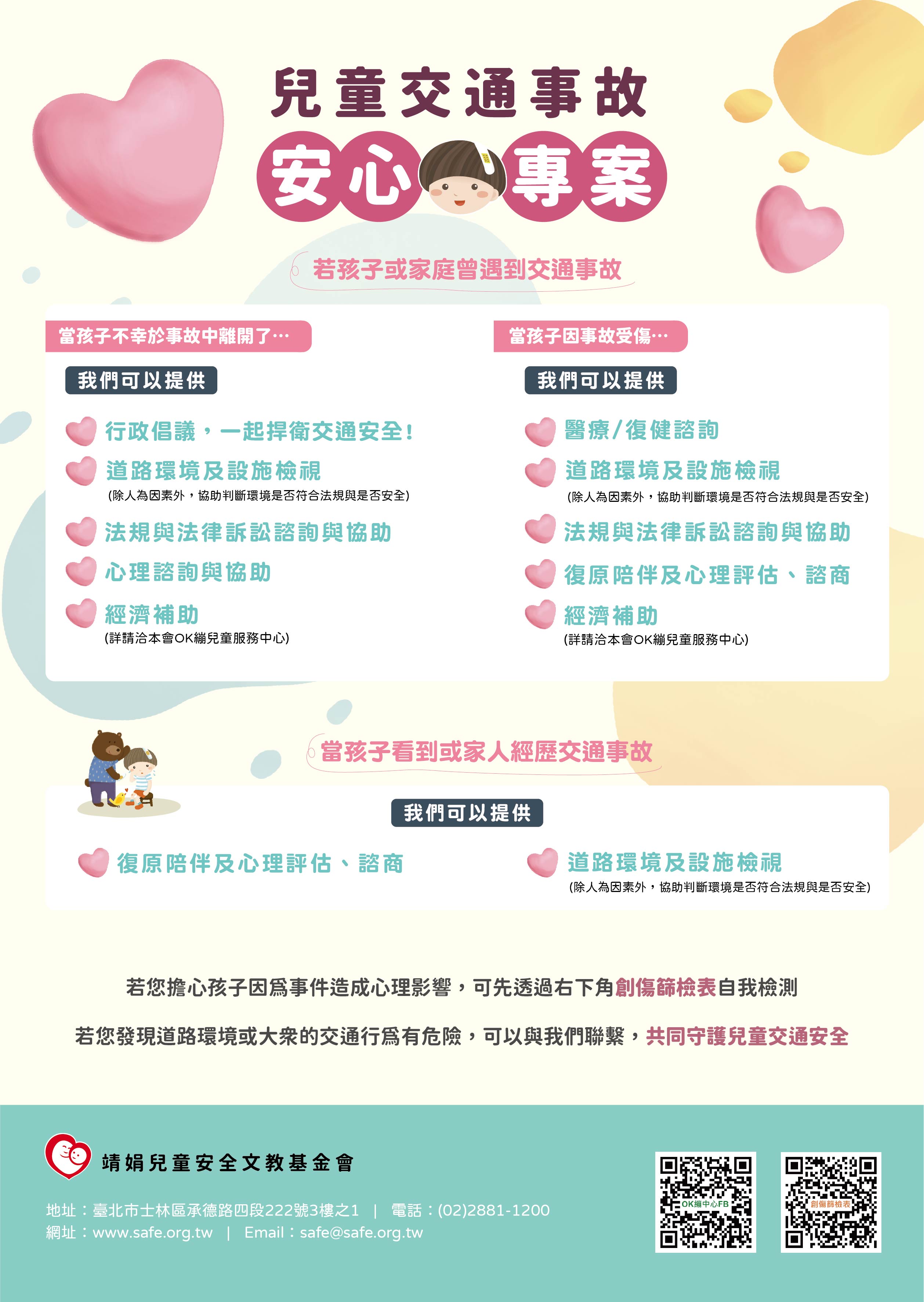 二、為協助兒少及其家庭面對交通事故後之問題及穩定就學,靖娟基金會自110年開辦「兒少交通事故安心專案」,以經 歷交通事故之兒少為核心,提供法律、醫療、心理、環境檢視與行政倡議之服務。