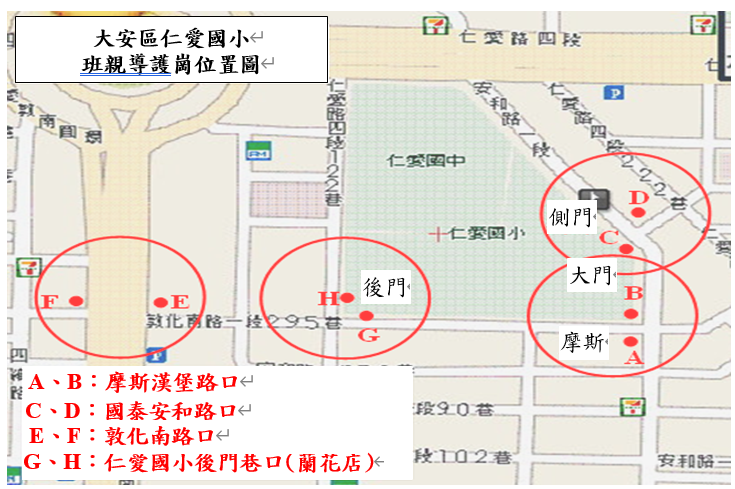 (1)A、B、C、D點,於仁愛國小大門導護裝備室領取